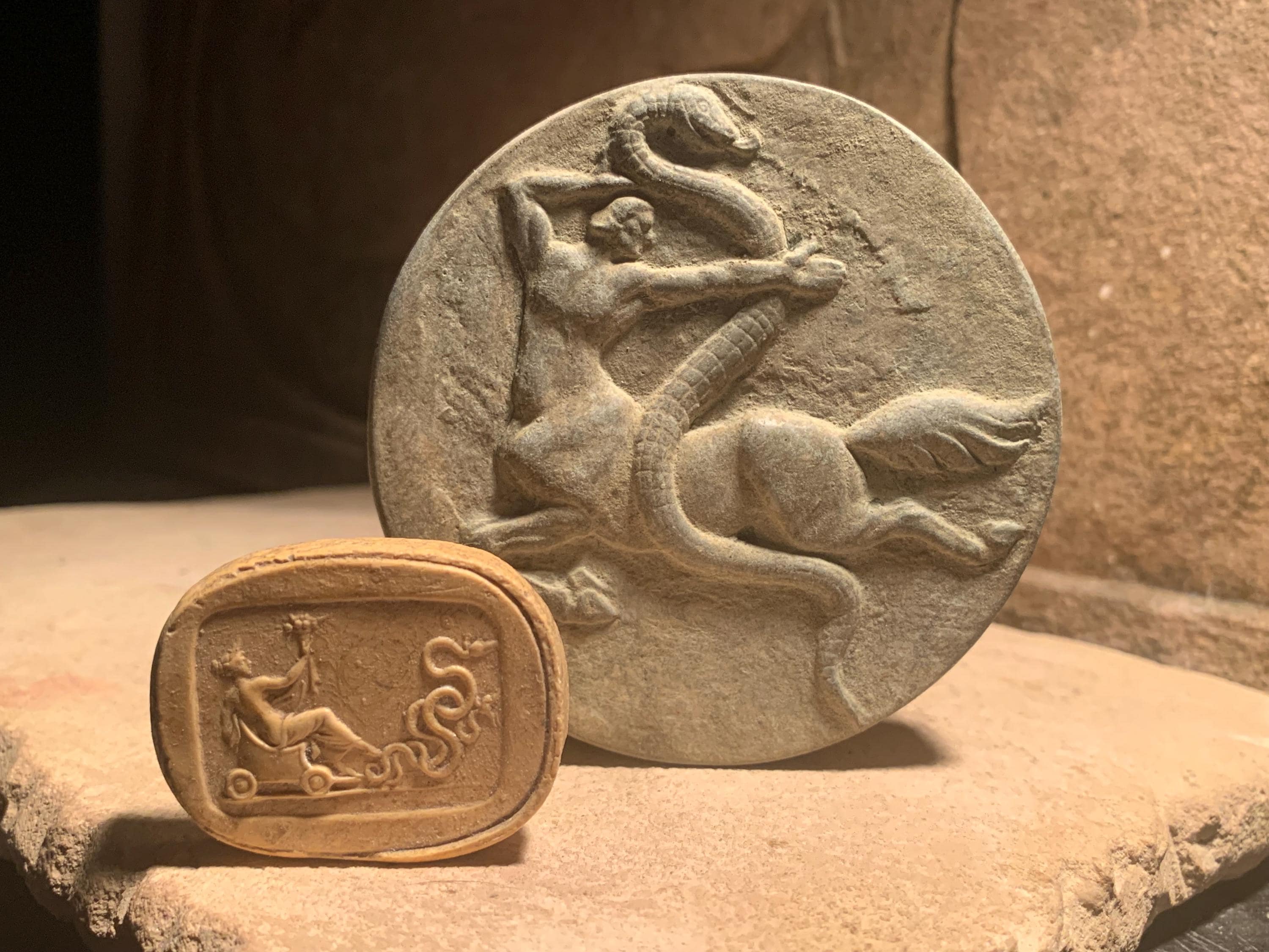 On offer here are a pair of amulets featuring the mythical Centaur and the Demi-god Triptolemus Of ancient Greek mythology.