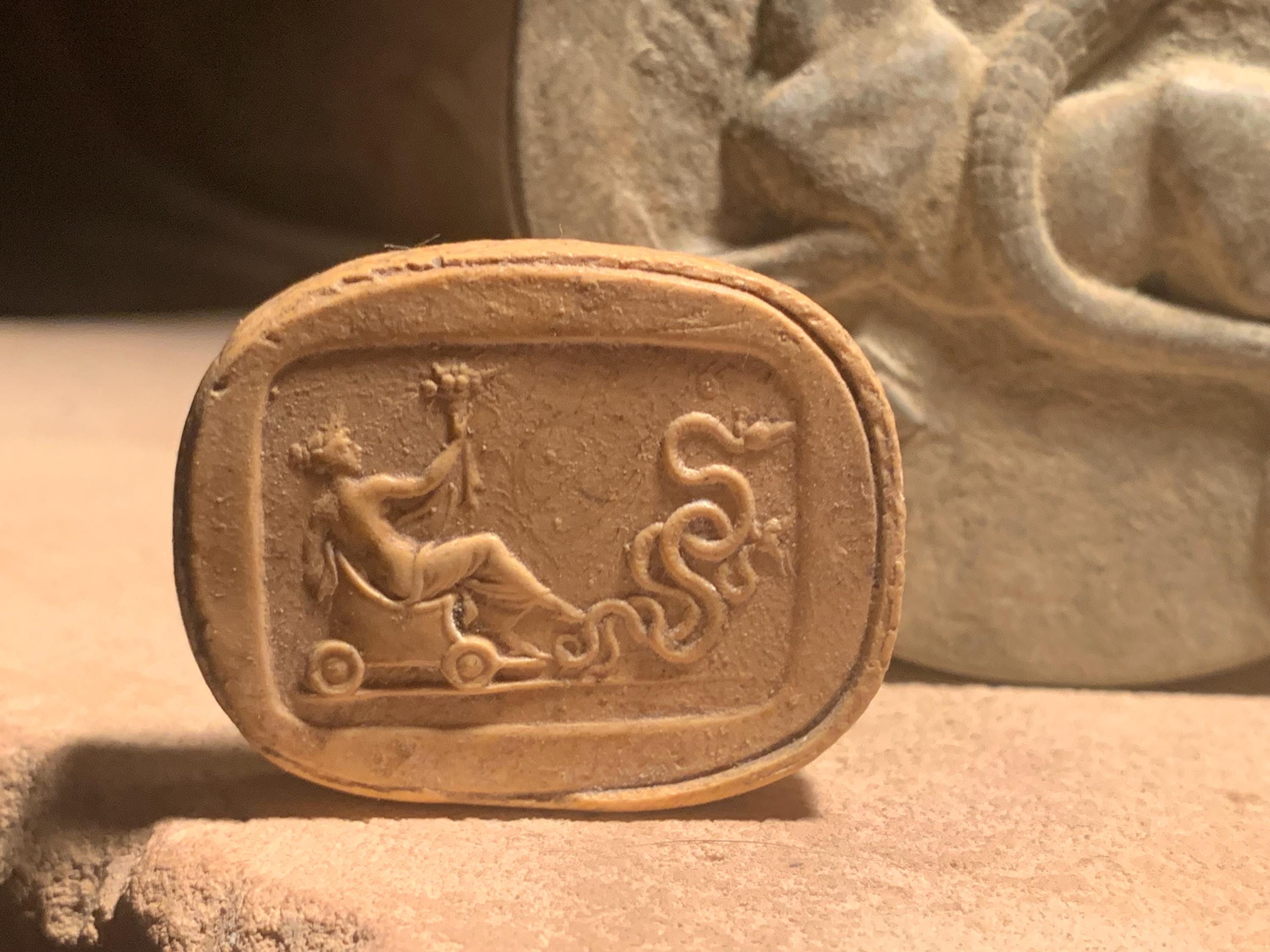 Triptolemus, under the tutelage of Demeter brought agriculture to mankind and is depicted in this small, but highly detailed amulet. Riding in a chariot / cart being drawn by serpents he extends his hand with a cornucopia of abundance.
