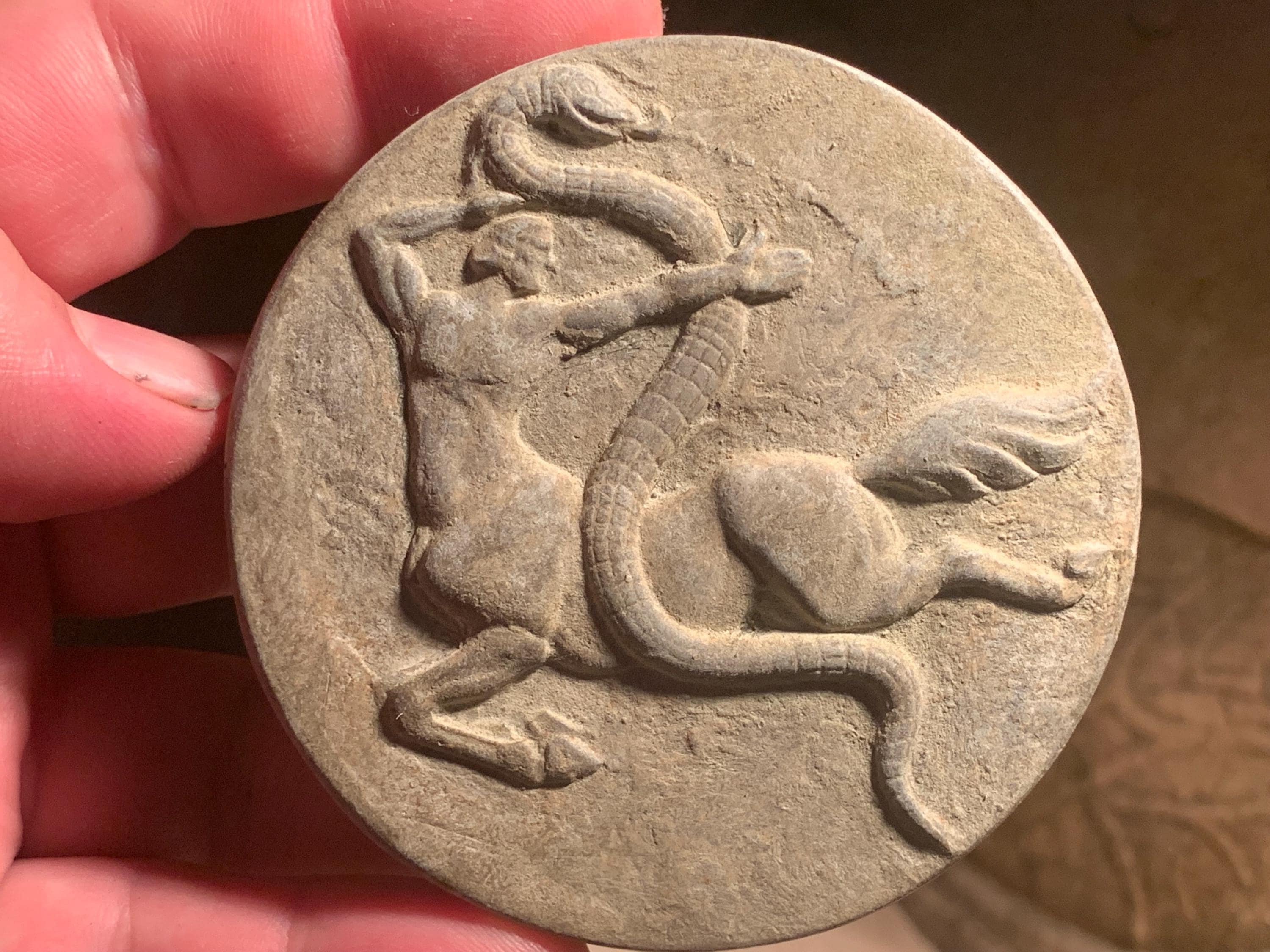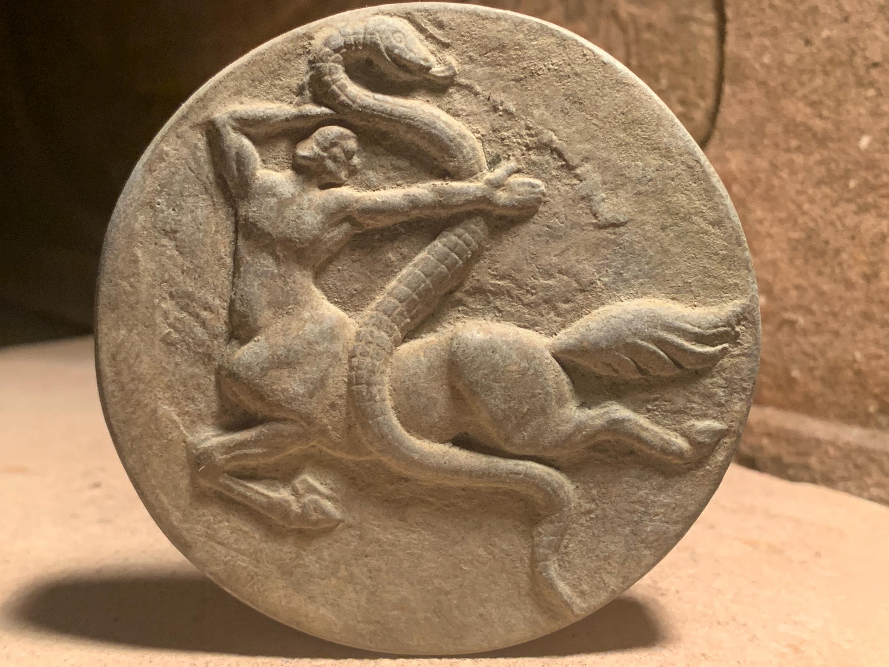 The amulet on offer shows a Centaur wrestling a serpent and the figure has fine muscle tone. Made of a limestone and quartzite composition stone, it has an aged ochre patina giving it a freshly excavated look.