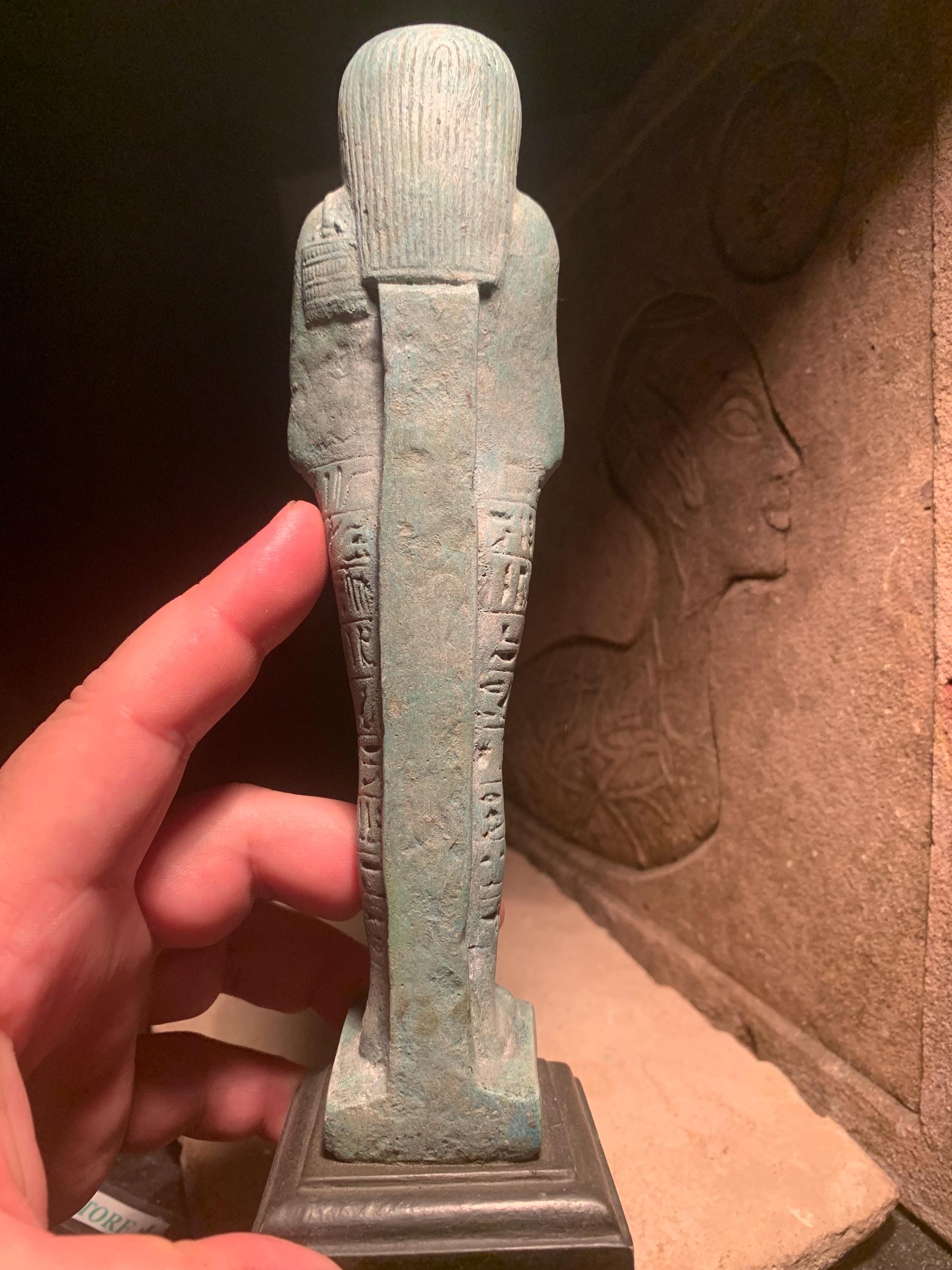 This is a replica of an actual Shabti that reproduce every detail of the original figure. He clutches farming implements to till the soil that would have been put to good use in the afterlife as well as a bag of seeds for planting thrown over the shoulder. The segments of a seed bag hanging off the shoulder can be seen in the rear view photograph.