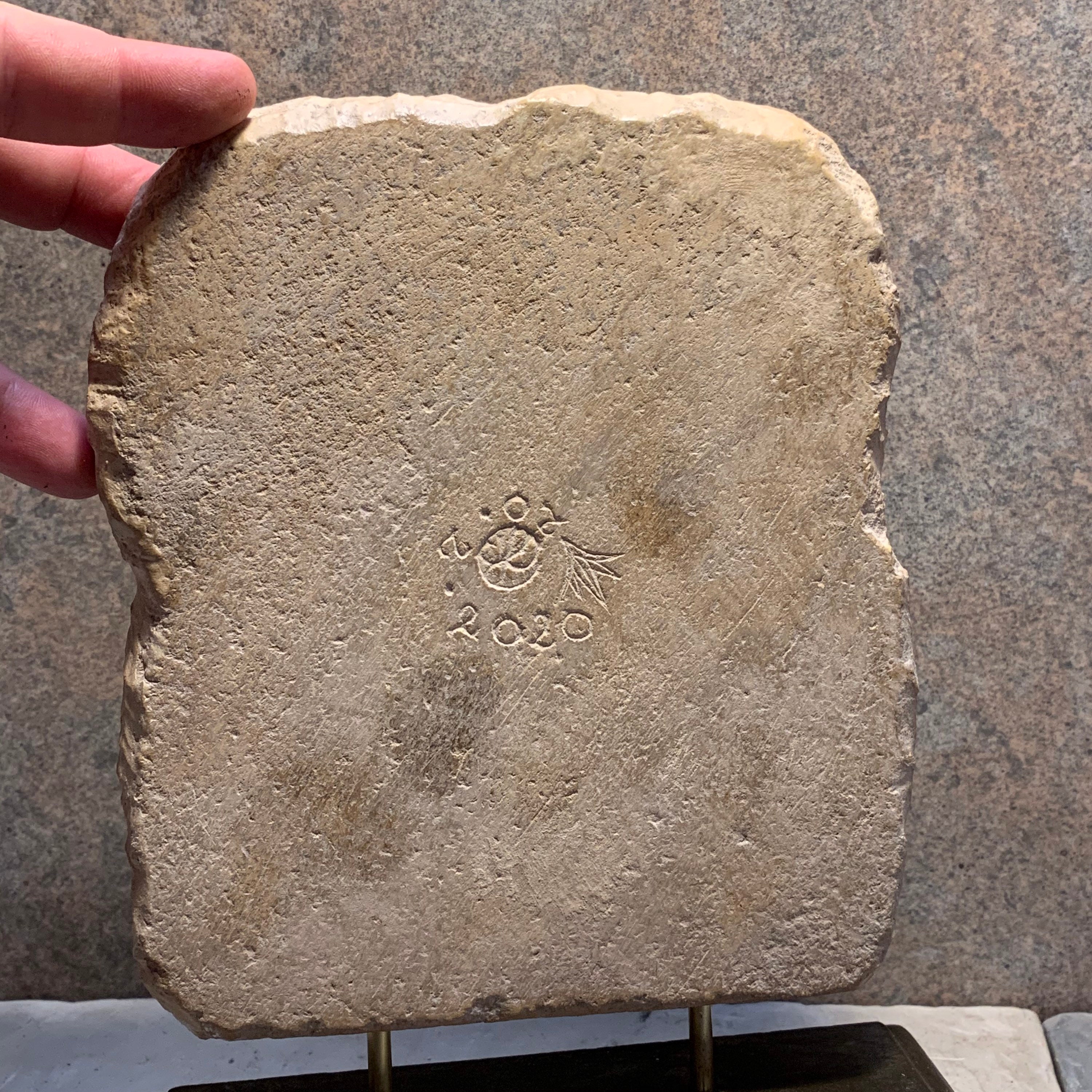 Made of a limestone and quartzite composition stone, it is mounted on a polished, felt based stand which provides an excellent support and is easily removable.