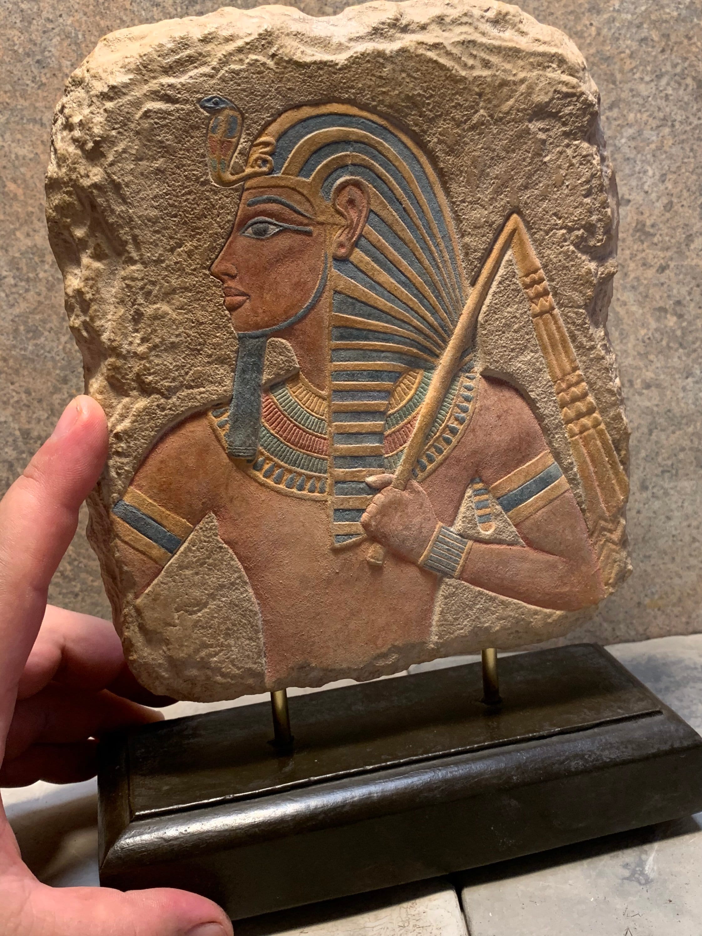 It is a sunken relief carving so will benefit from good overhead lighting that will highlight the details. I have used a simple desk lamp in these photo's which really brings out the cheek bones and distinctive grooves of the headdress.