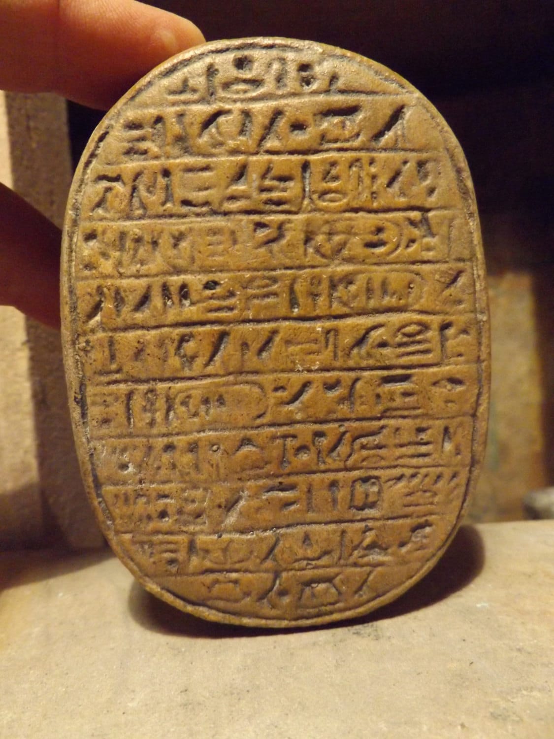 The original scarab that this replica is based on, was found in the vicinity of the ruins of Buhen, a major fort and town in the far south of Egypt near the second cataract of the Nile. This mighty fort was very sadly lost when the modern Aswan dam was built in the 1960’s submerging the entire region. The discovery of the scarab was thus a very lucky find and it offers insight to how the news of the day could be heard so far away.