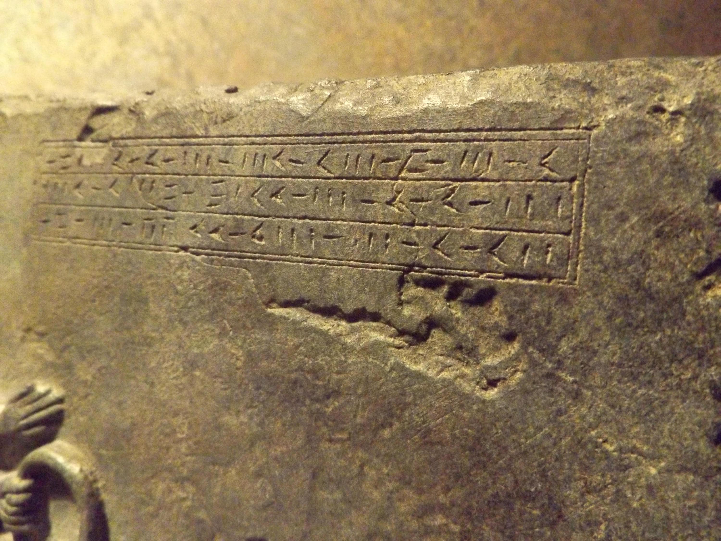 Stylized cuneiform writing can be seen flanking the god in the upper portion of the carving.