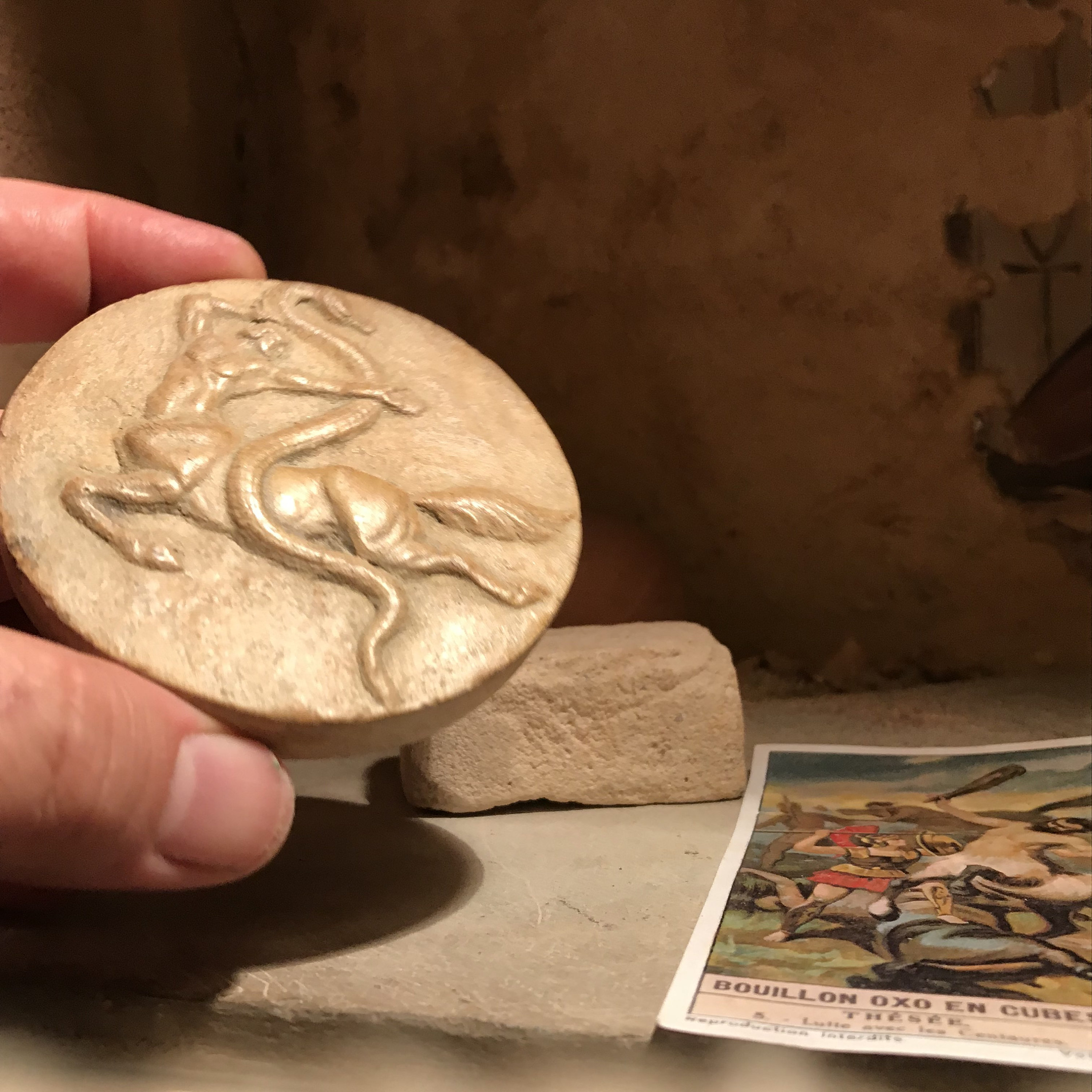 The amulet on offer shows a Centaur wrestling a serpent and the figure has fine muscle tone. Made of a limestone and quartzite composition stone, it has an ancient colour tone giving it a freshly excavated look.