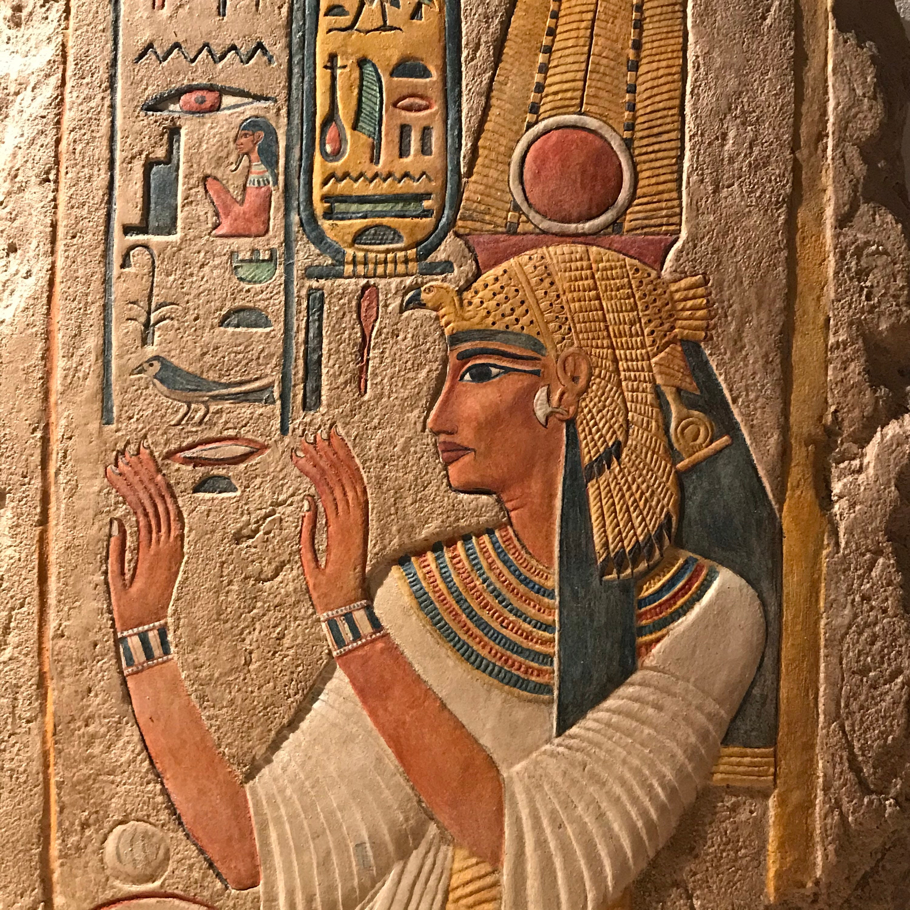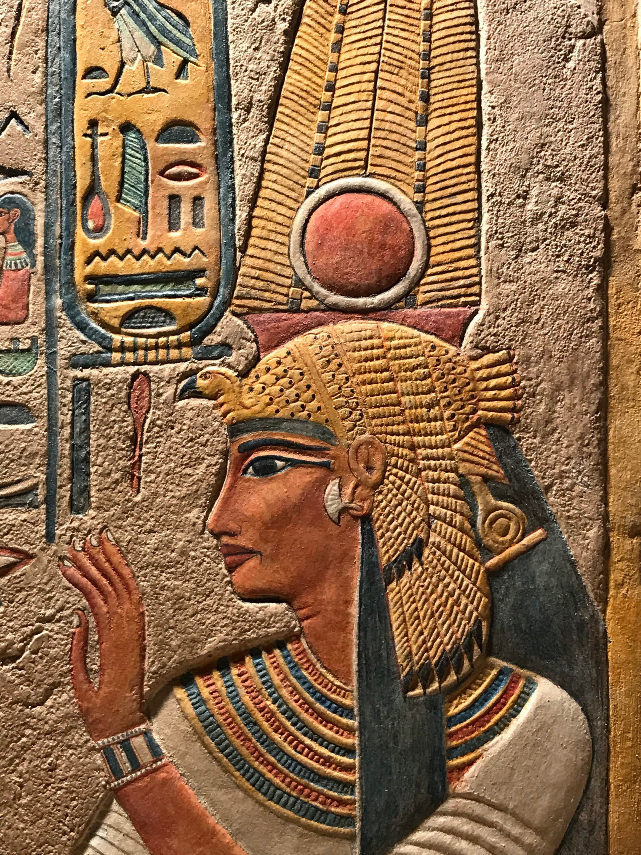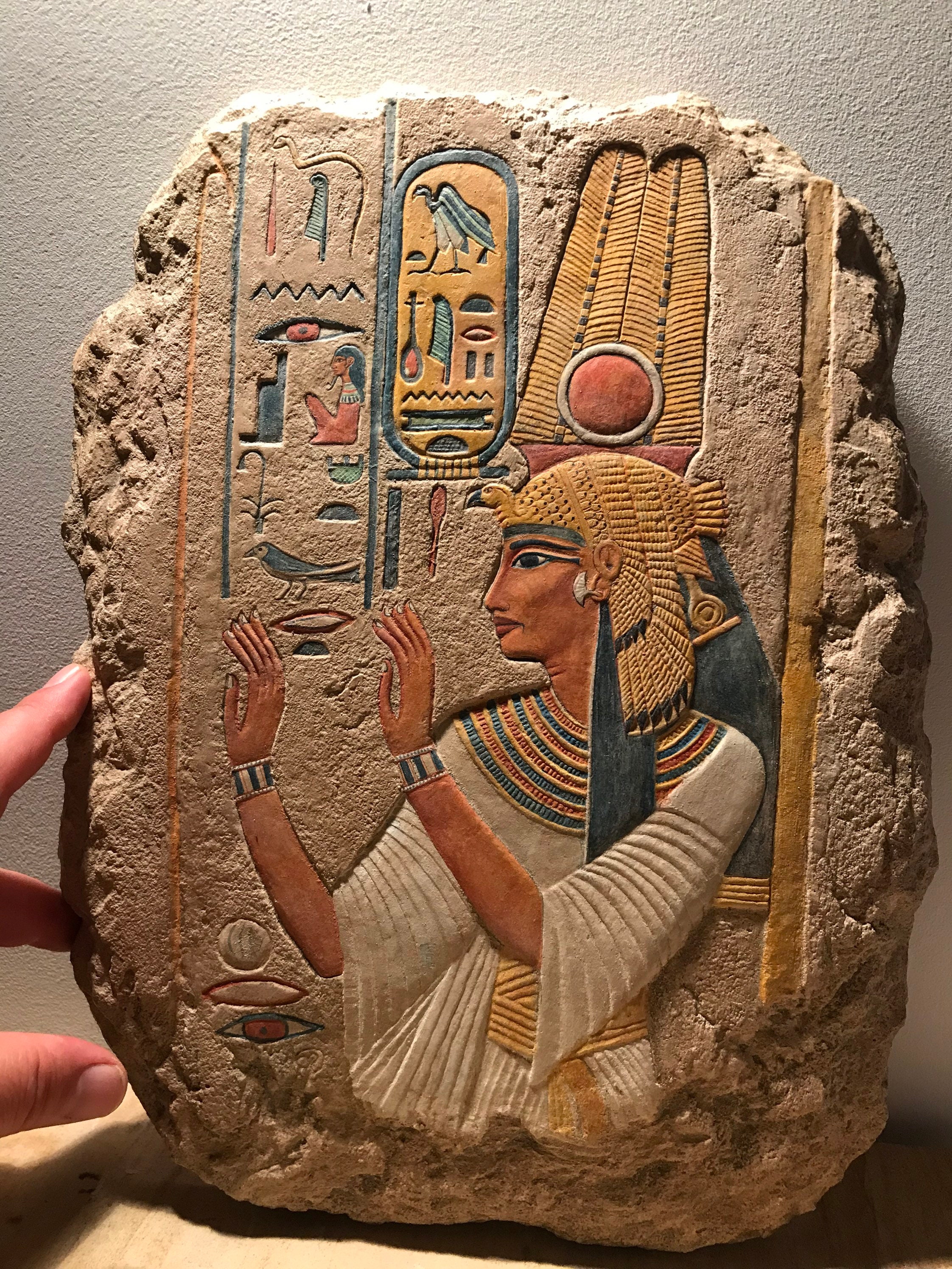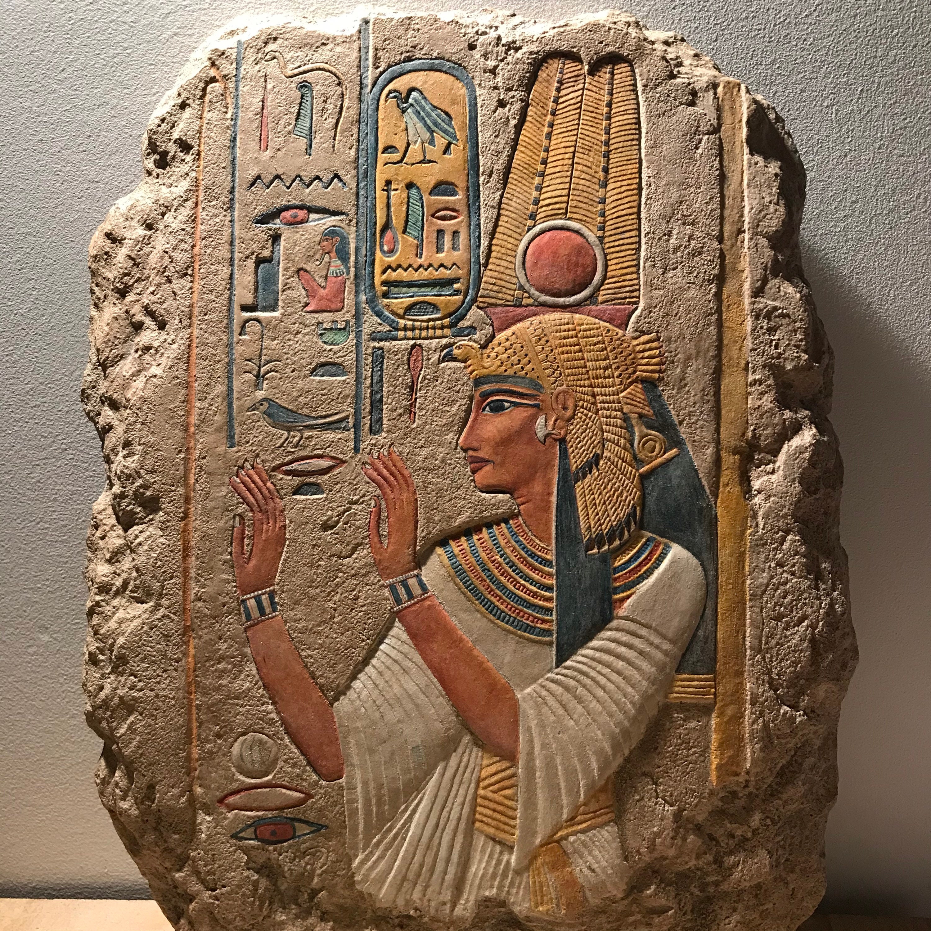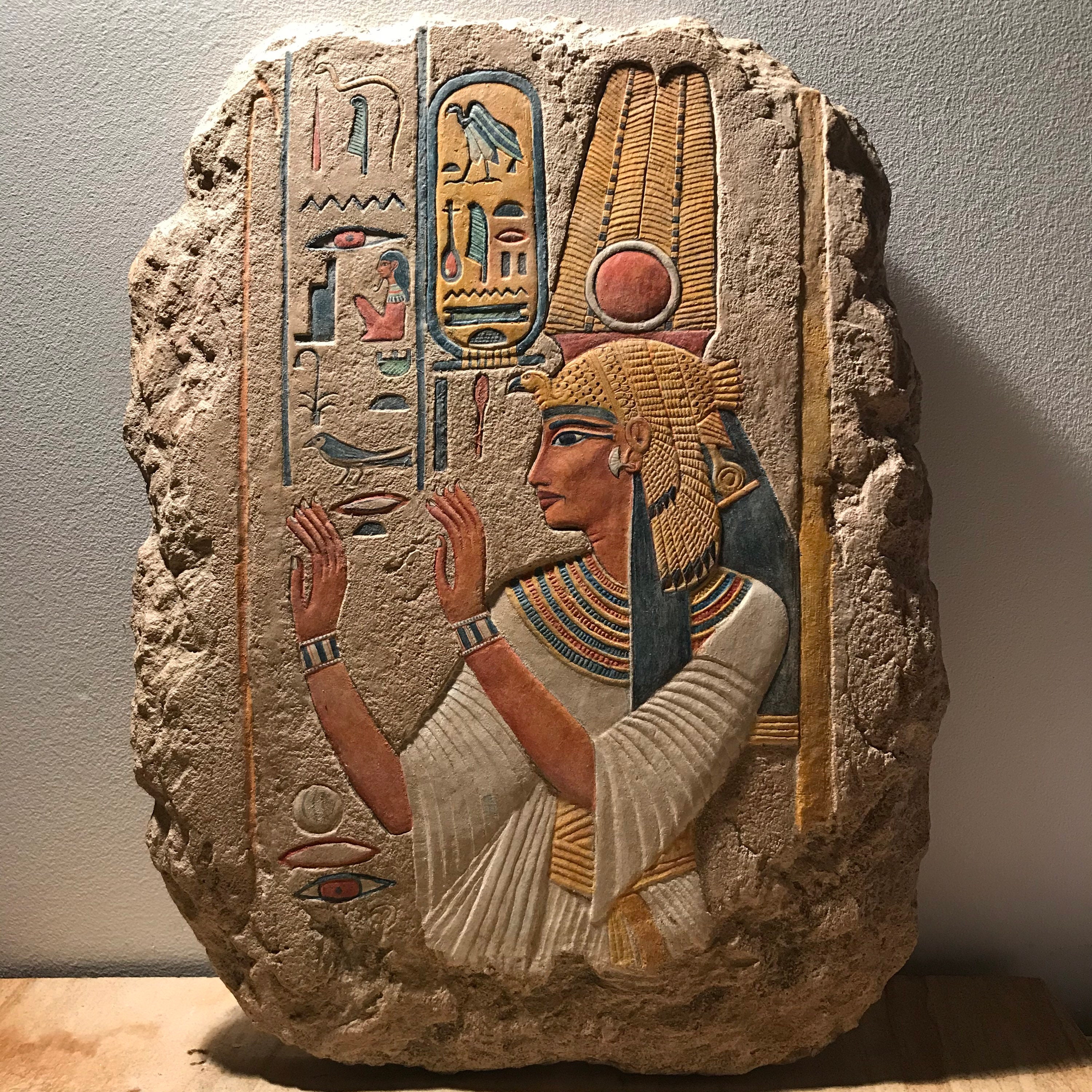 On offer here is a finely painted relief carving of the beloved wife of Ramses the Great - Nefertari. Made of a limestone and quartzite composition stone it has an aged patina with many unique hand painted details. It is a signed 2019 edition based on my original 1995 master carving.