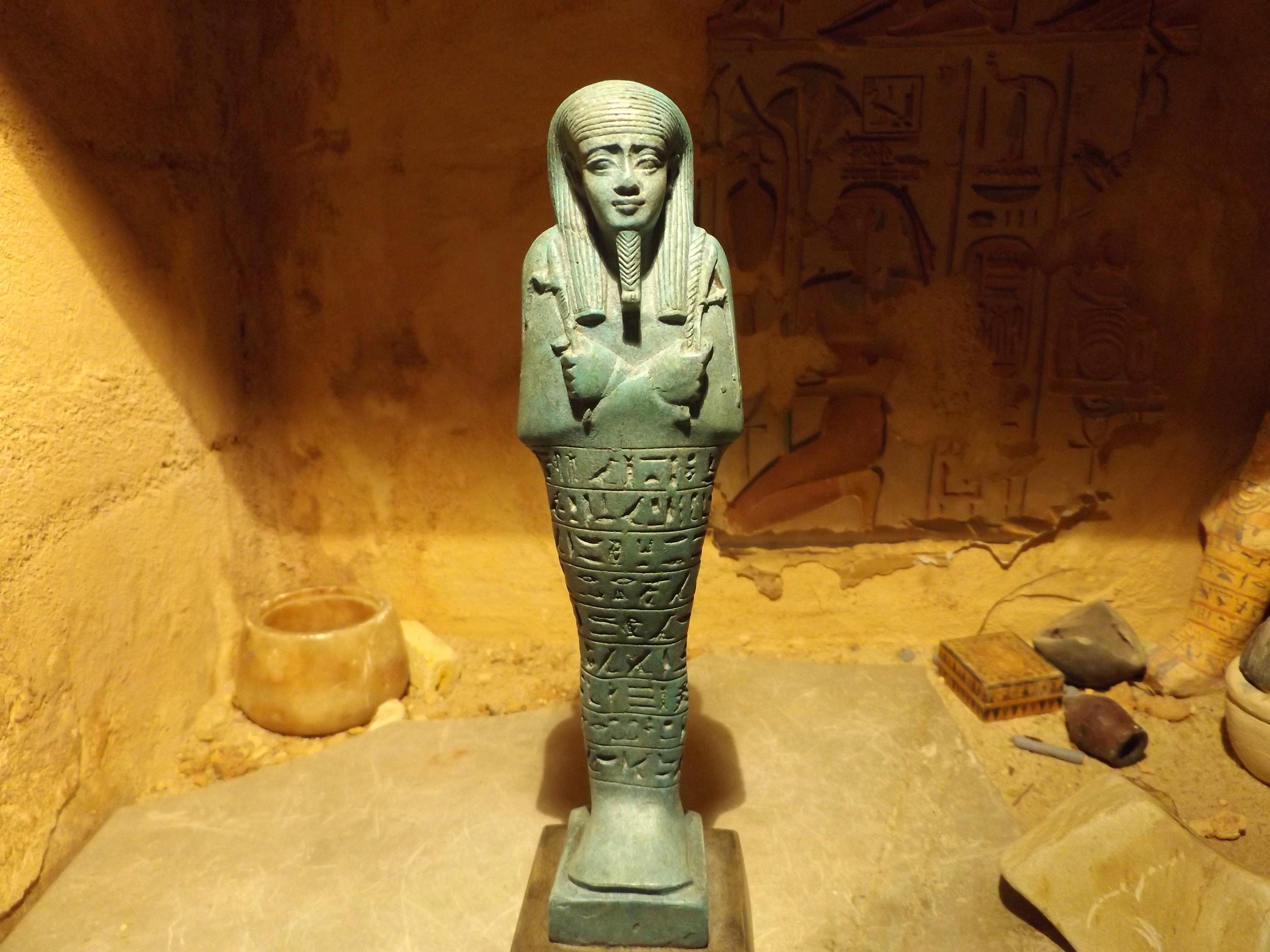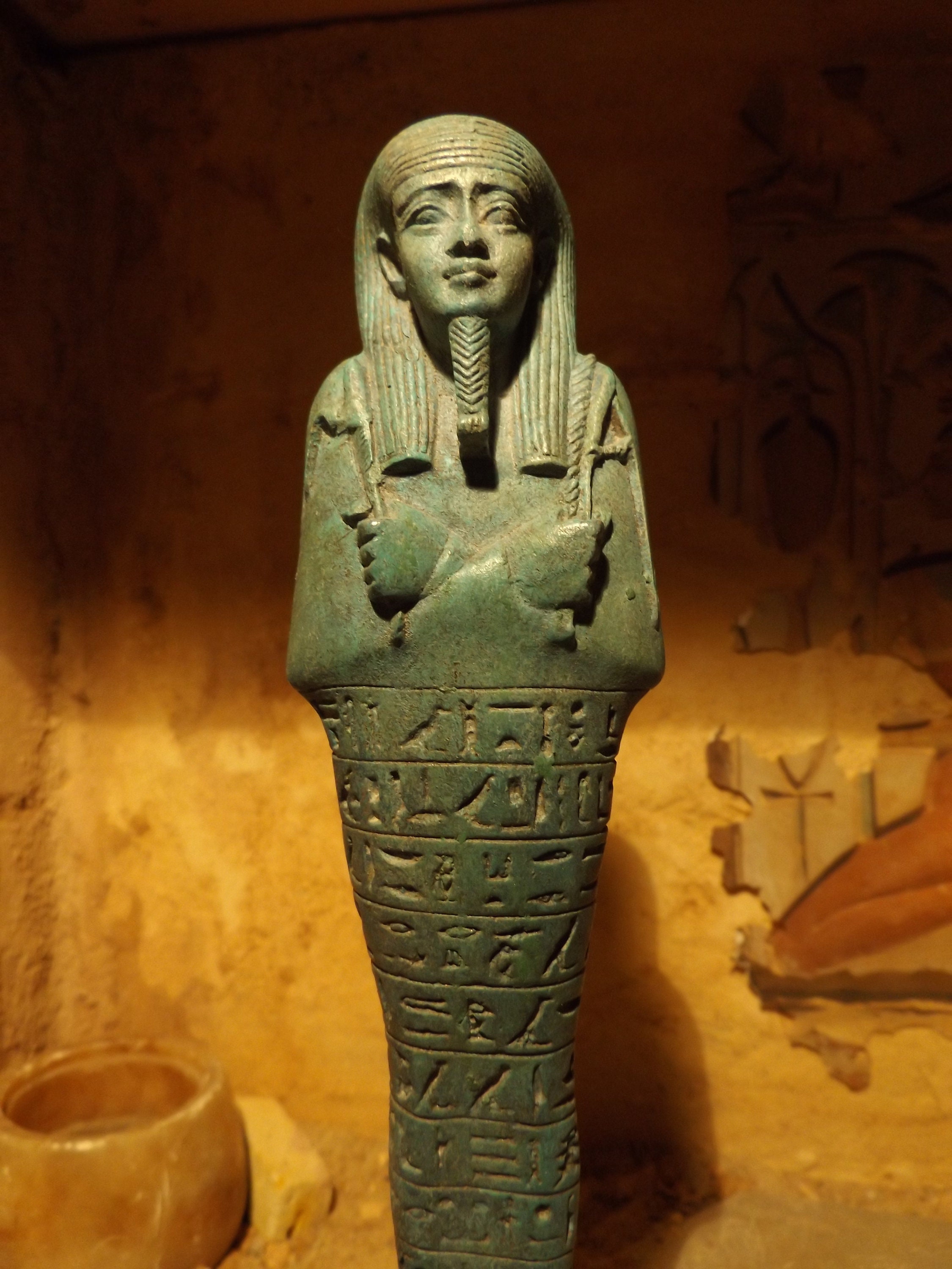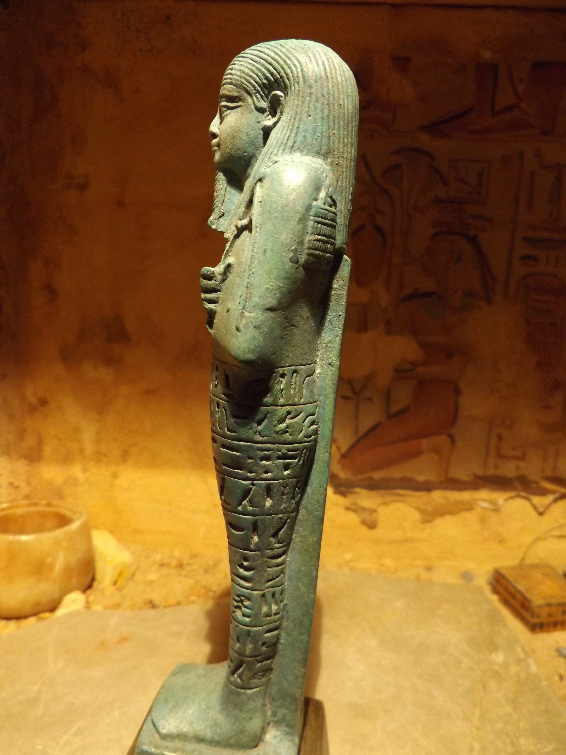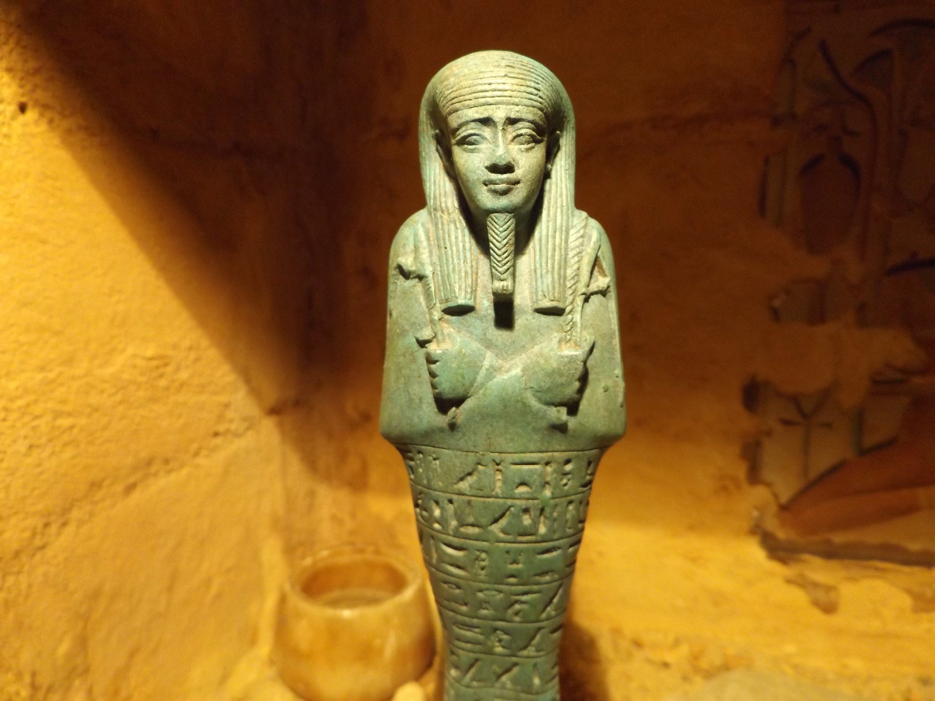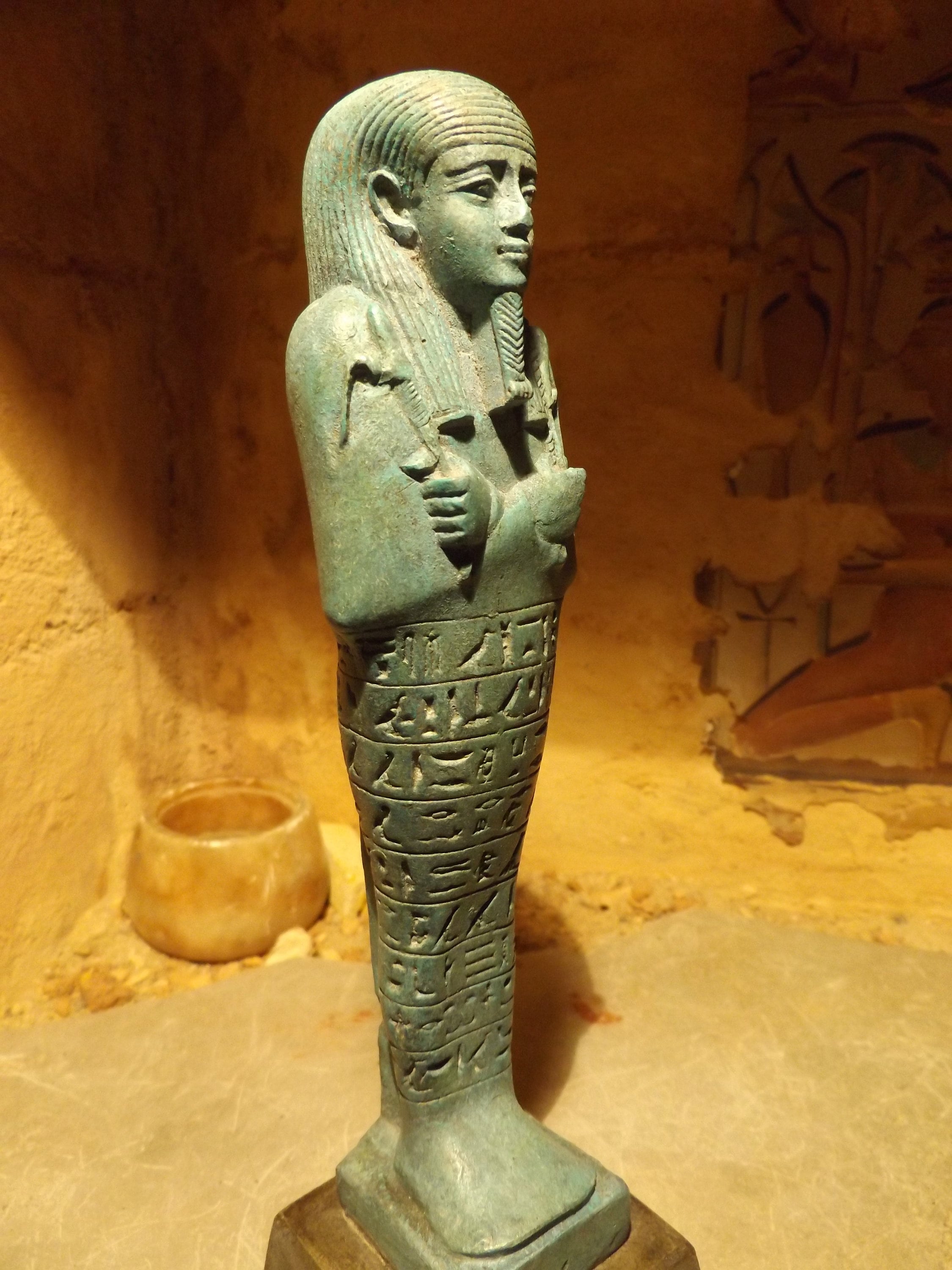 The name stems from the Sha-wab tree, as early figures were made from its wood. Later figures employed a great variety of materials such as clay, faience{opaque blue green glass} plaster and stone depending on what you could afford. These figures were placed within the tomb of an individual to magically come to life performing any work required by the god Osiris in the afterlife. A modest burial would have one or two figures, however during the late period the quantities included within a burial increased to allow a shabti for each day of the year plus overseers. Some burials had even more