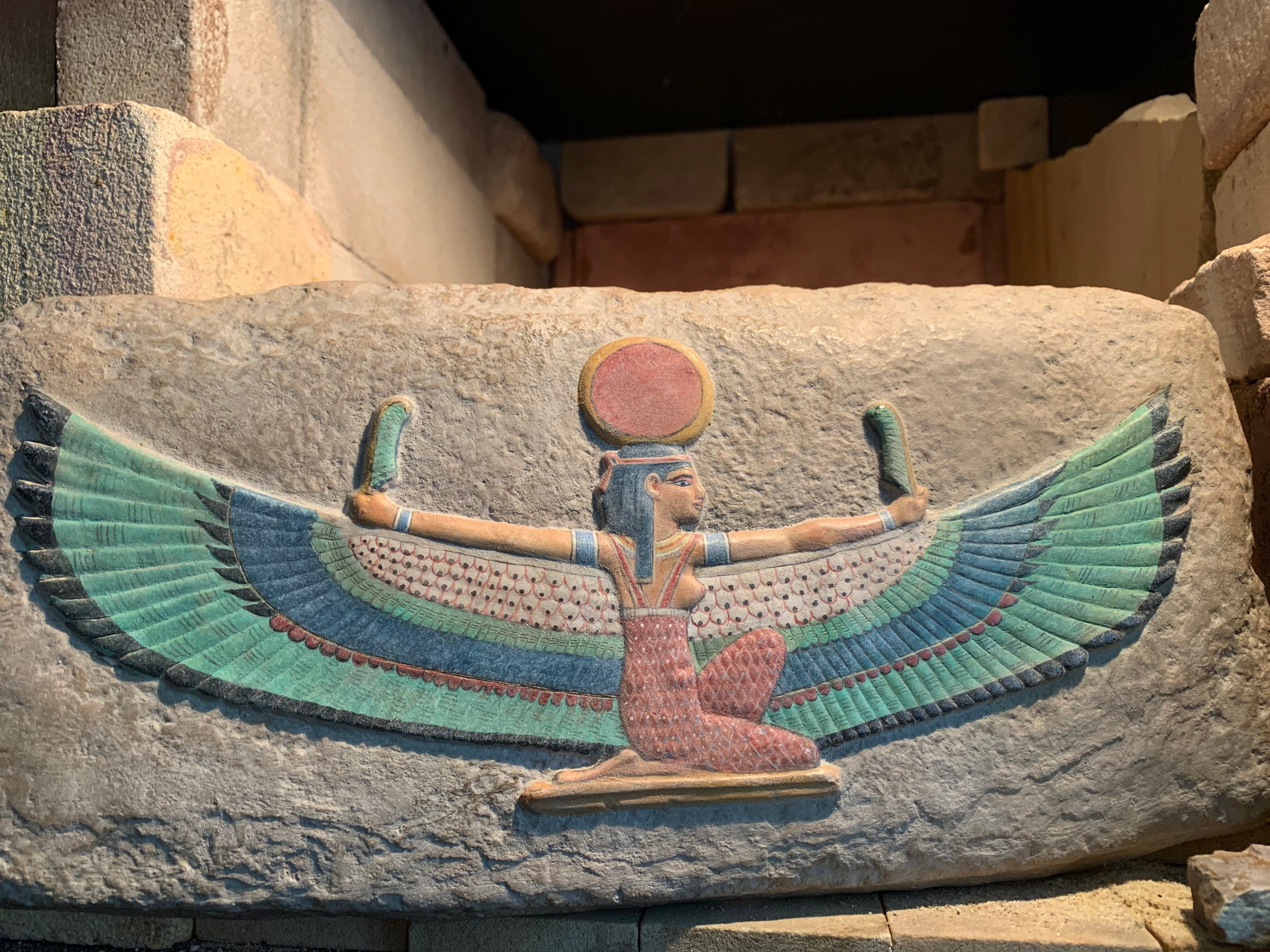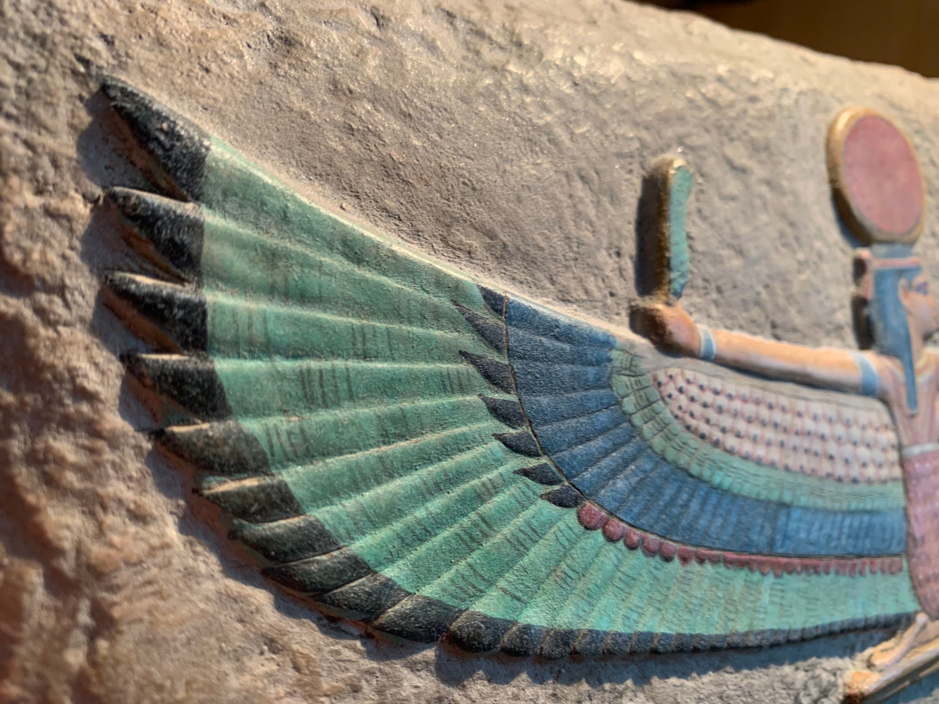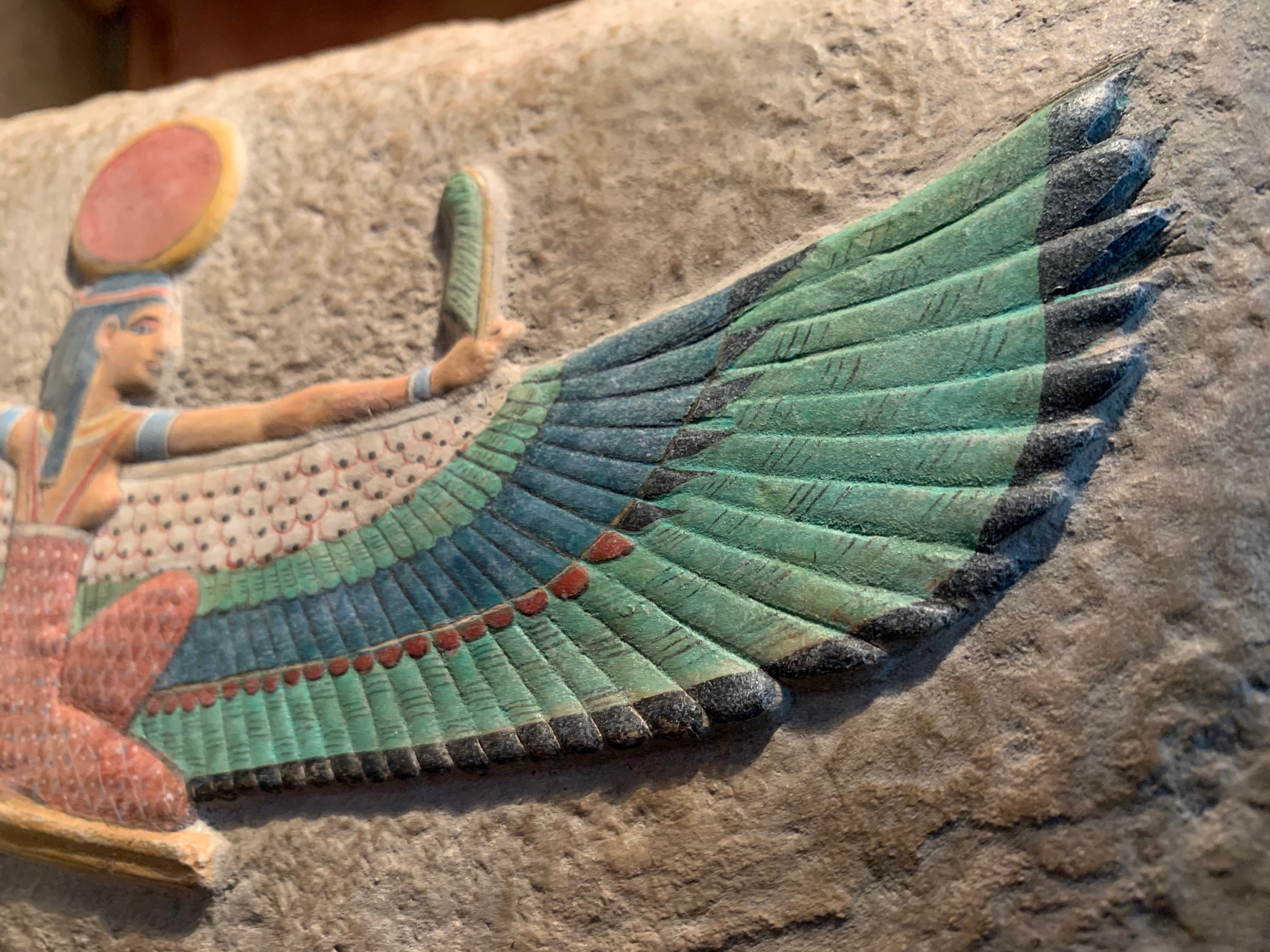 In this representation she is still in possession of her identifying symbols as she holds a pair of feathers in each hand within the framework of fully unfurled wings. This pose was usually reserved for the sky goddess Nut or Isis in amulets and imagery painted or carved into coffins where the wings were seen as protection. A shield against calamity in the afterlife.