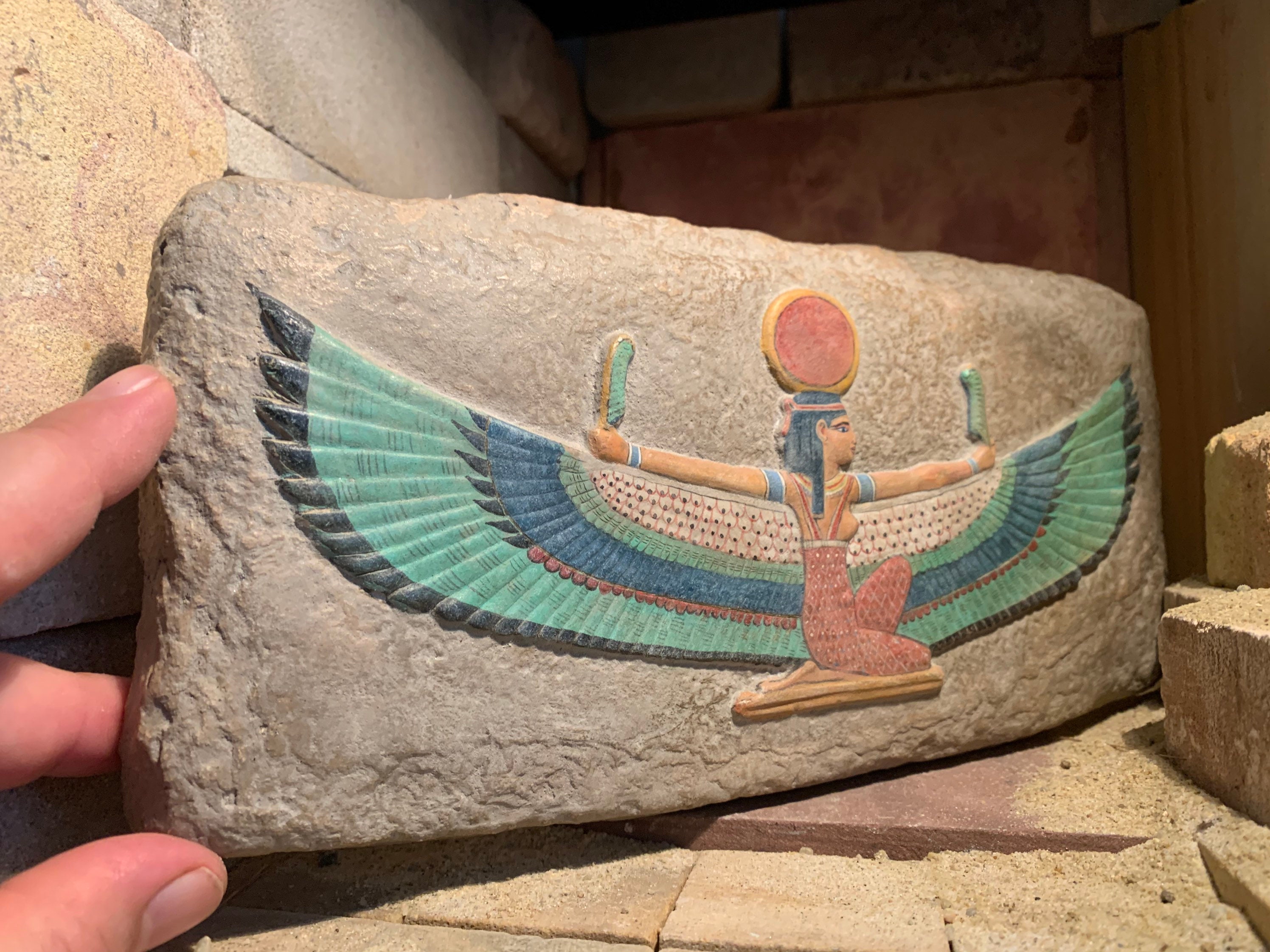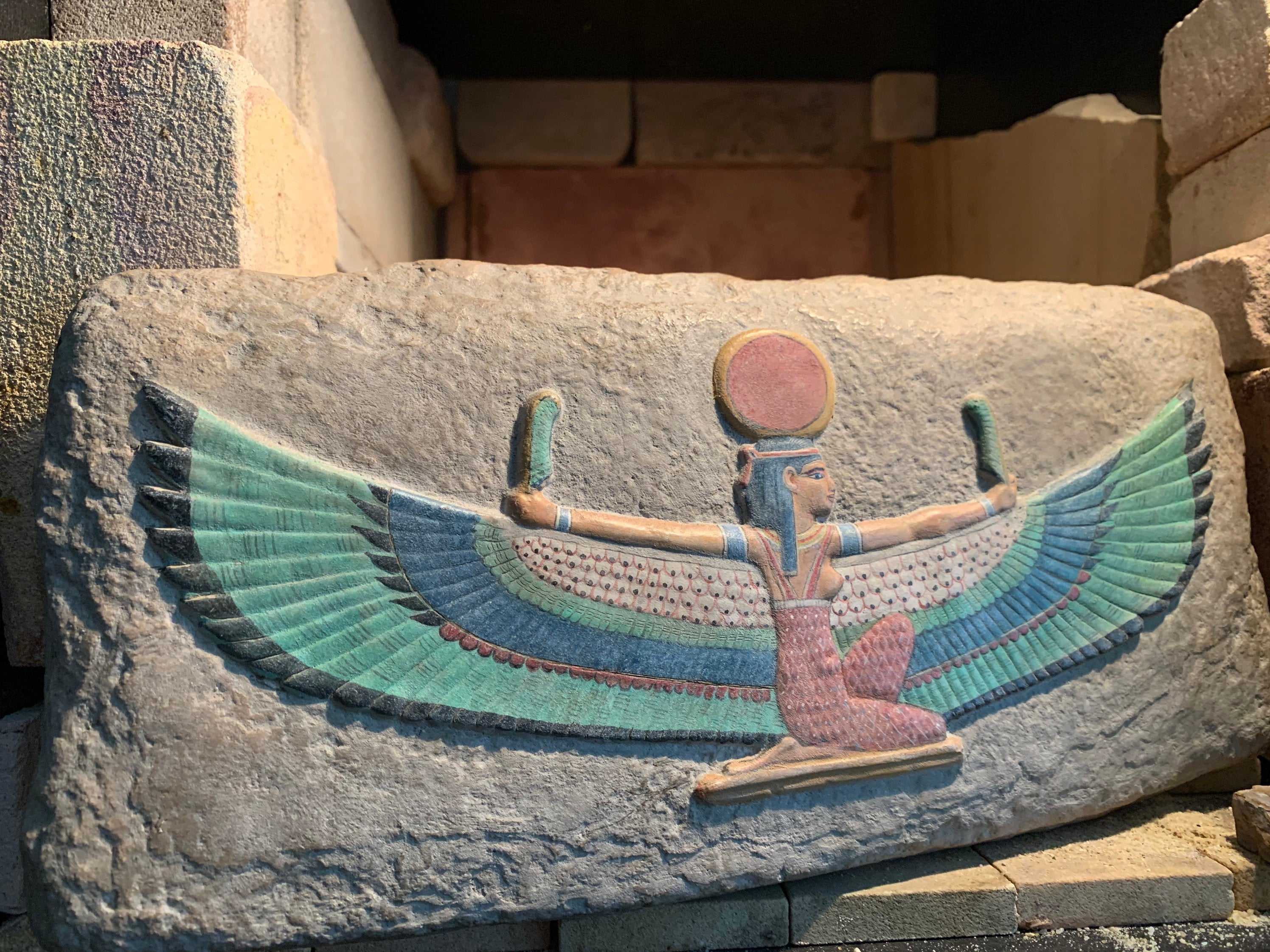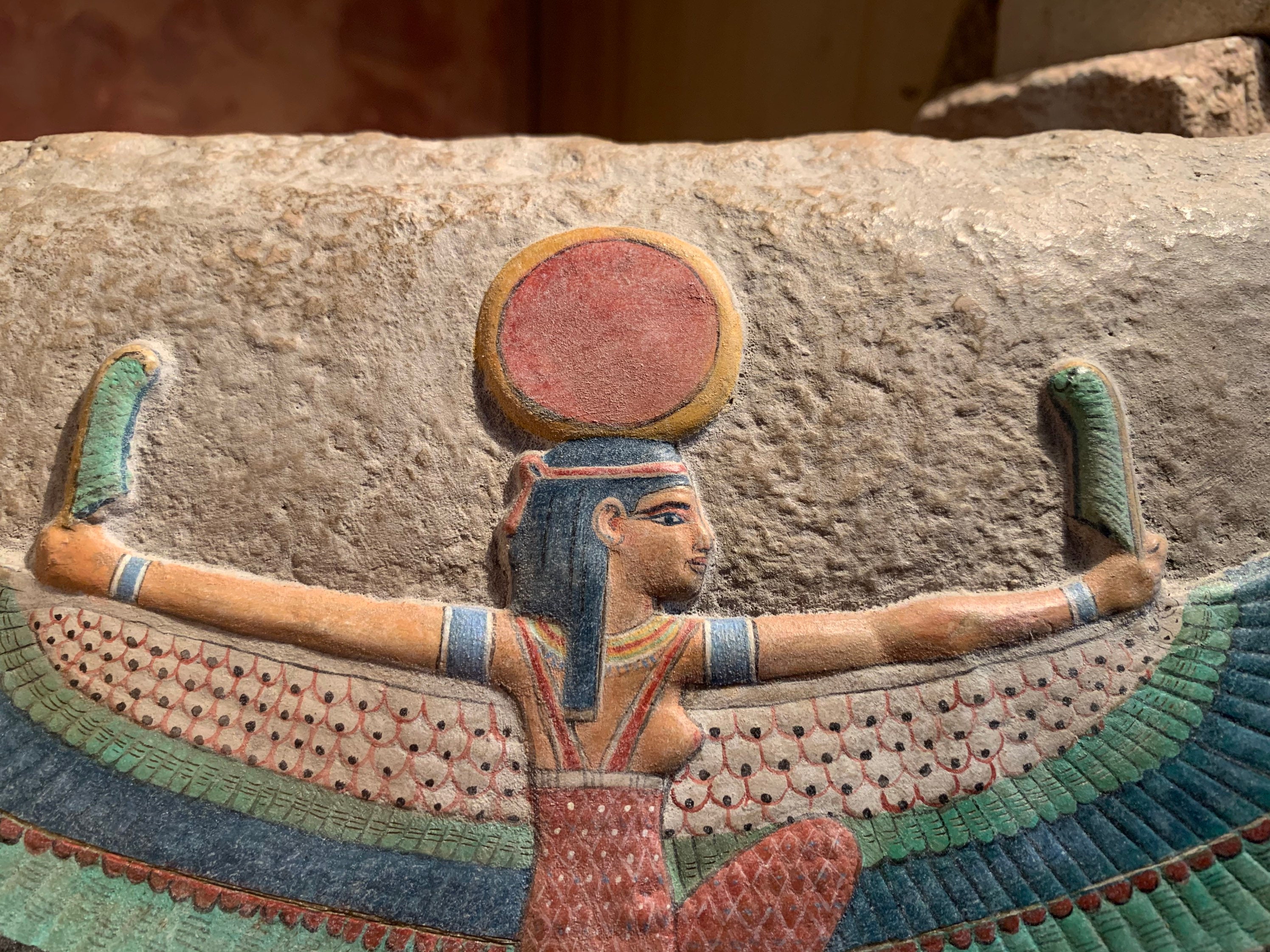 In this representation she is still in possession of her identifying symbols as she holds a pair of feathers in each hand within the framework of fully unfurled wings. This pose was usually reserved for the sky goddess Nut or Isis in amulets and imagery painted or carved into coffins where the wings were seen as protection. A shield against calamity in the afterlife.