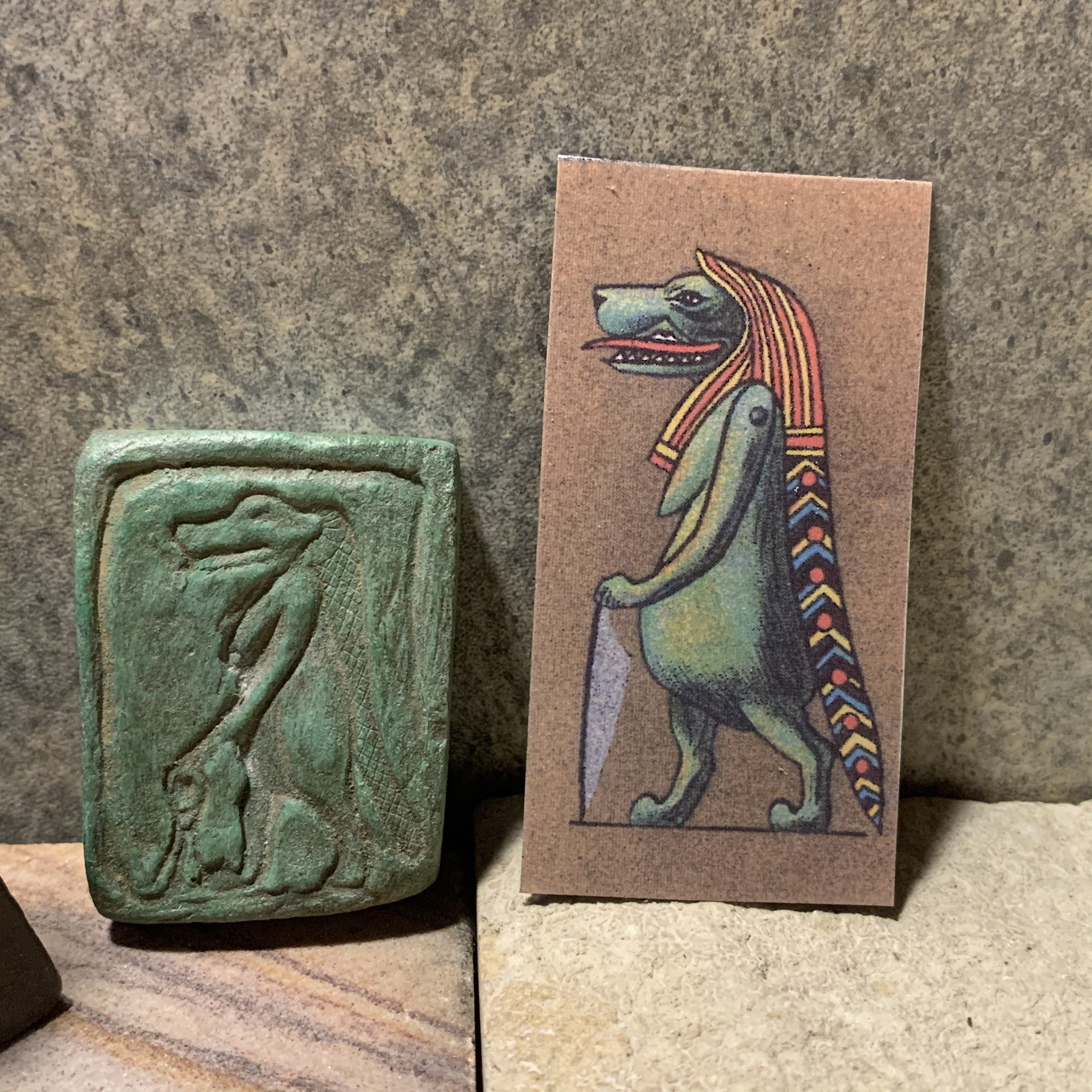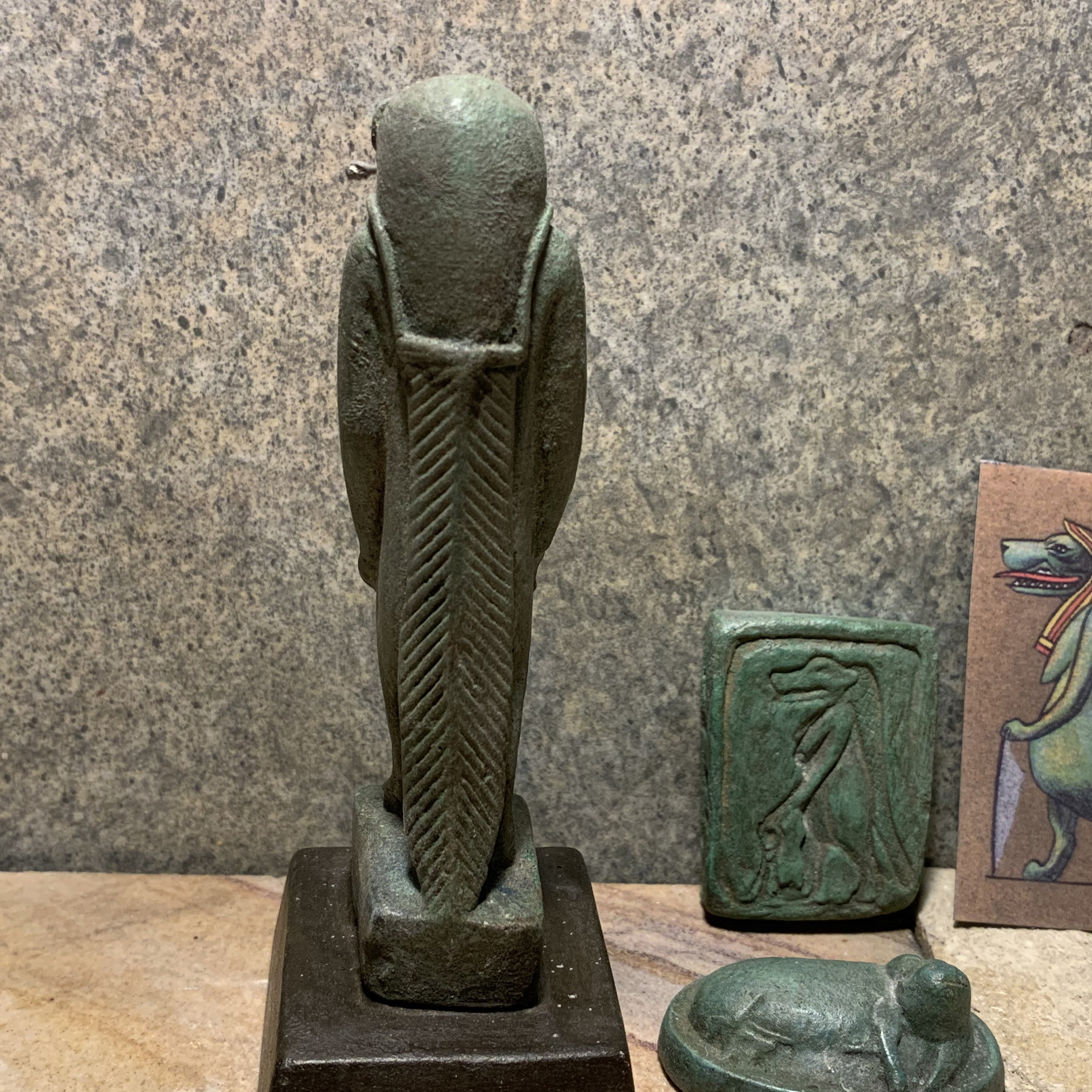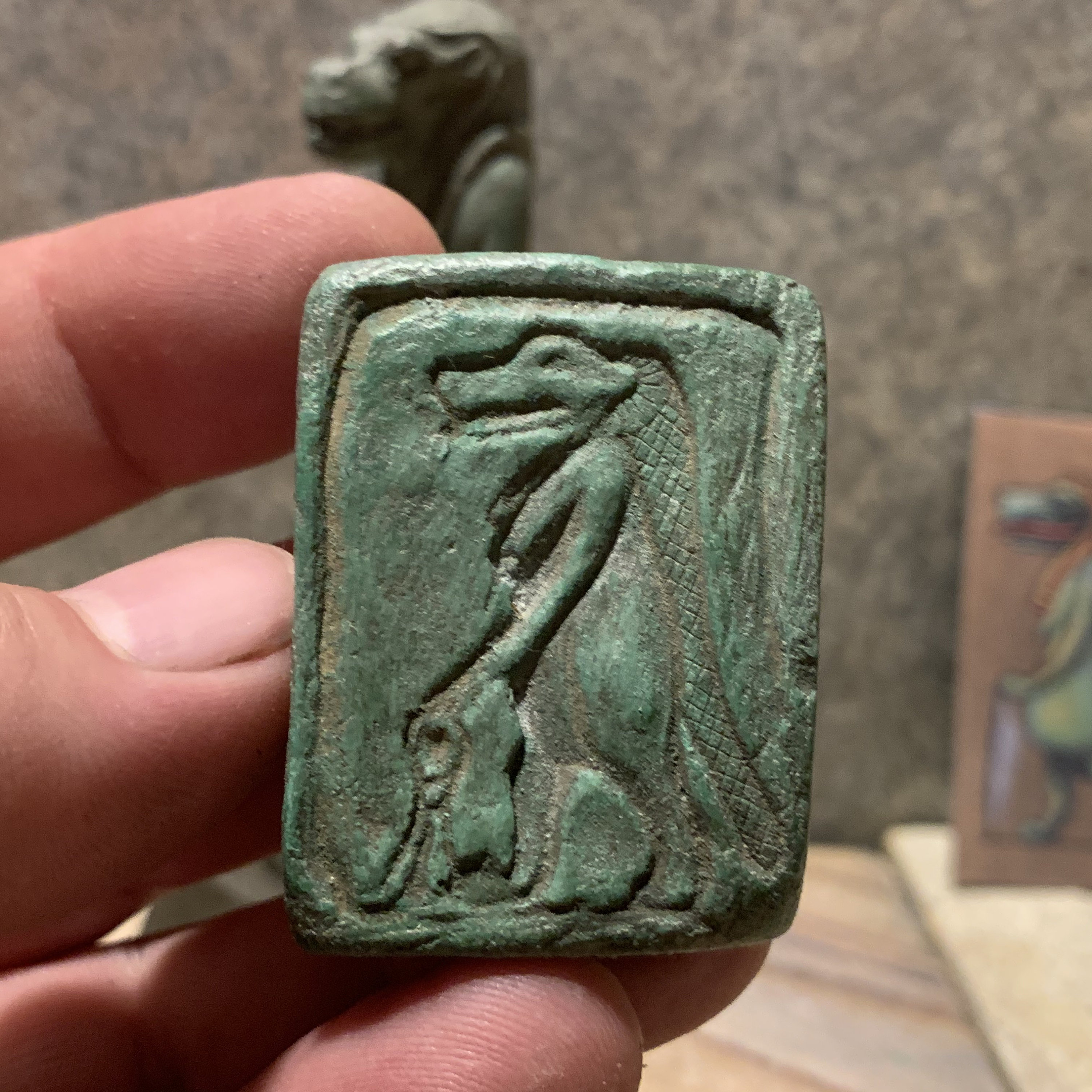 The rectangular amulet is a perfect match as it depicts Tauret in the same stance but in the form of a profile relief carving. The other amulet features a reclining hippo which was her sacred animal. A replica collector card of early 20th century design further rounds out the collection with a fine illustration of Taweret.