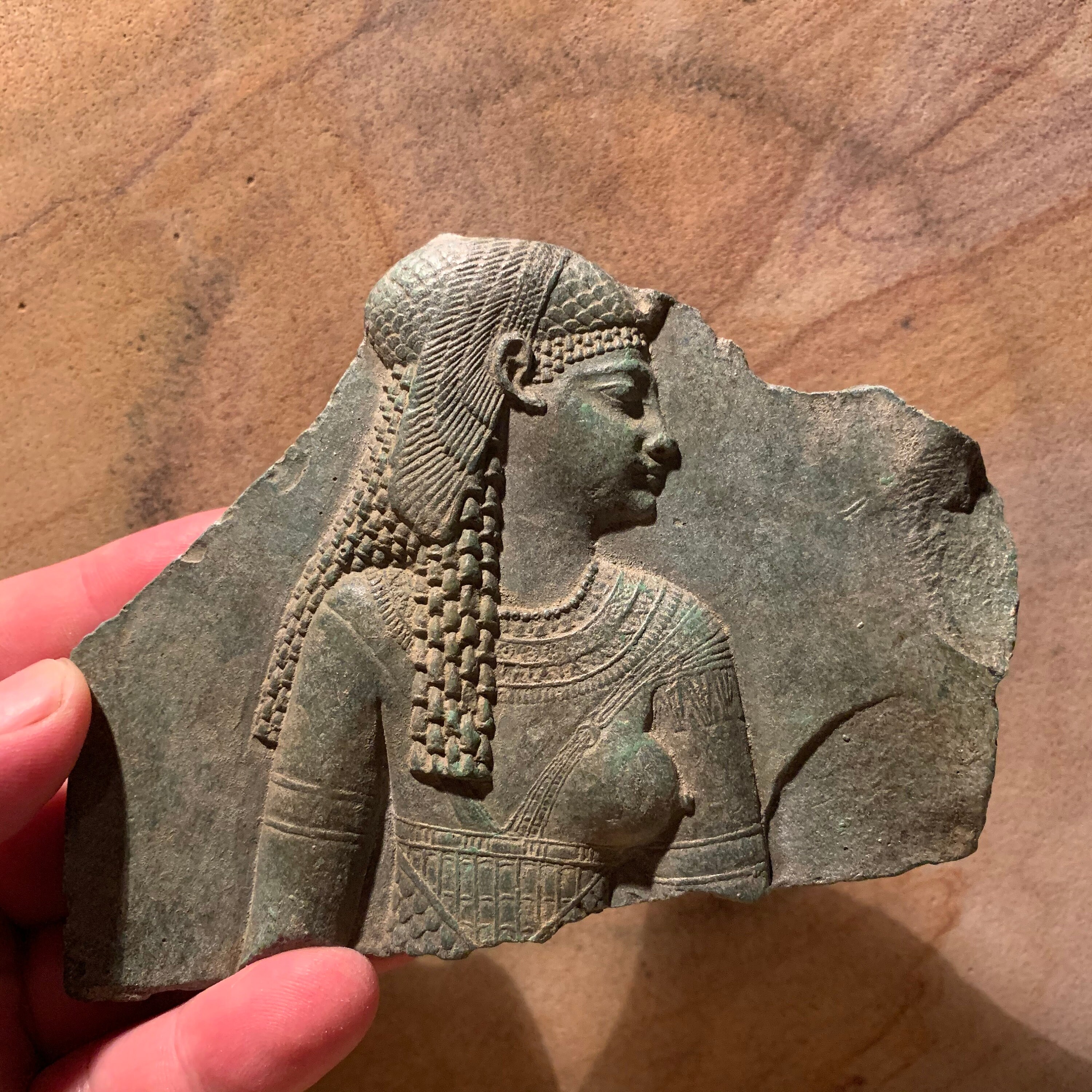 This very realistic fragment replica shows one of the best known surviving portraits of the legendary Cleopatra - the last Queen of Egypt. This was Ptolemaic style at its finest with typical high relief jutting above the surface plain of the stone displaying intricate details of face and costume details.