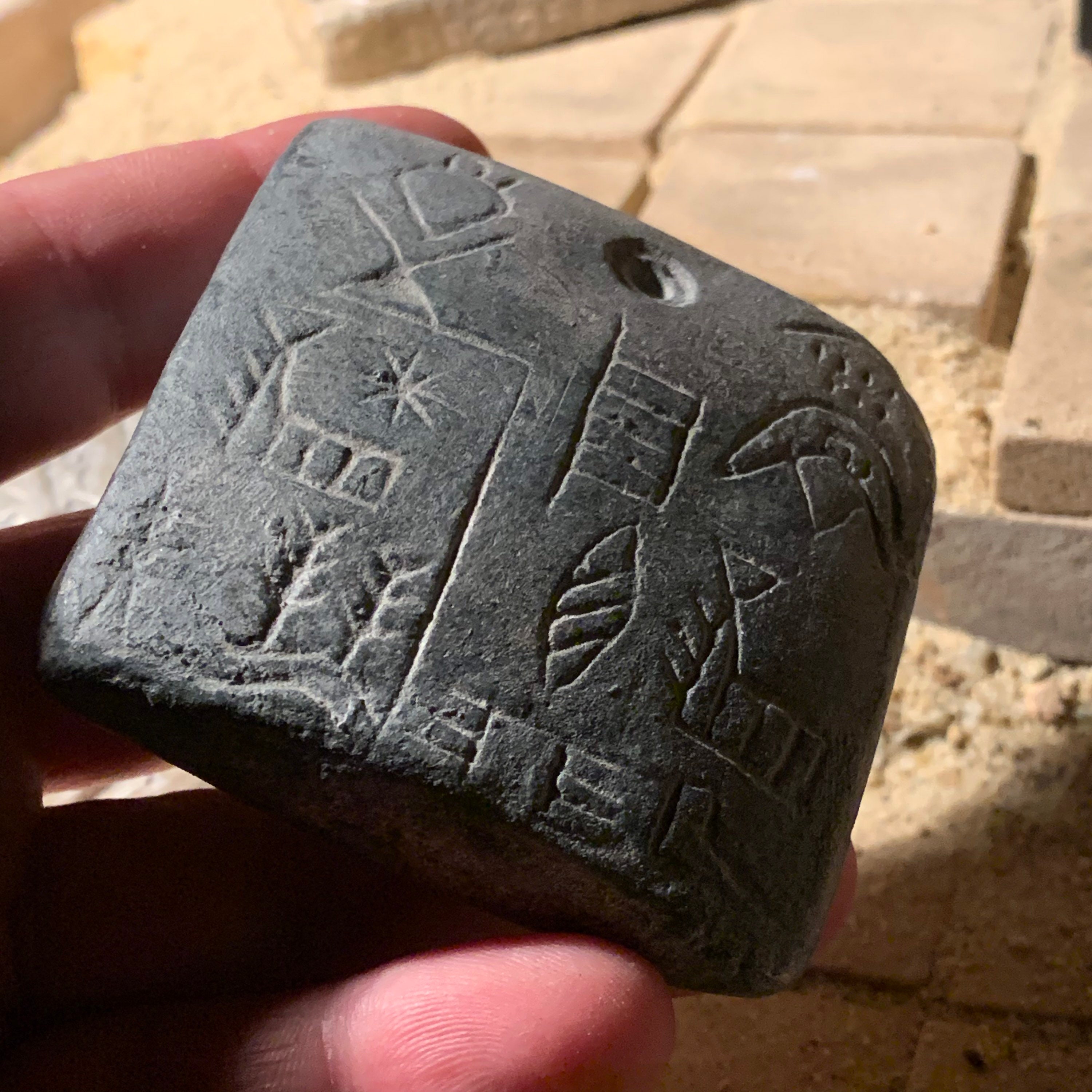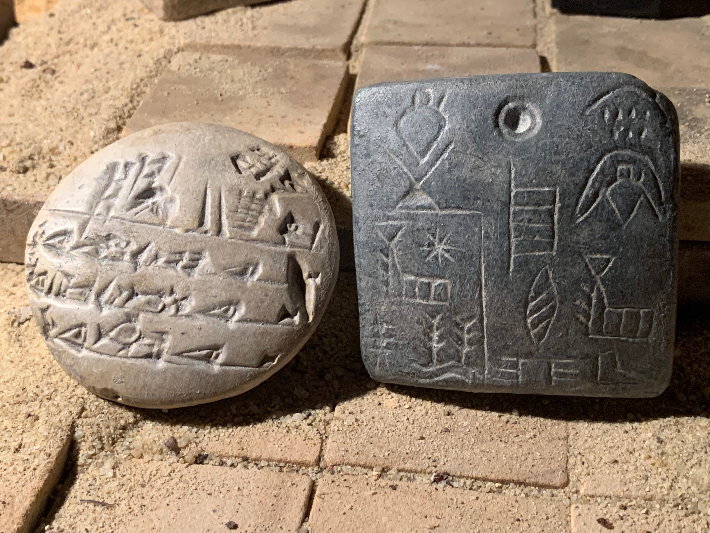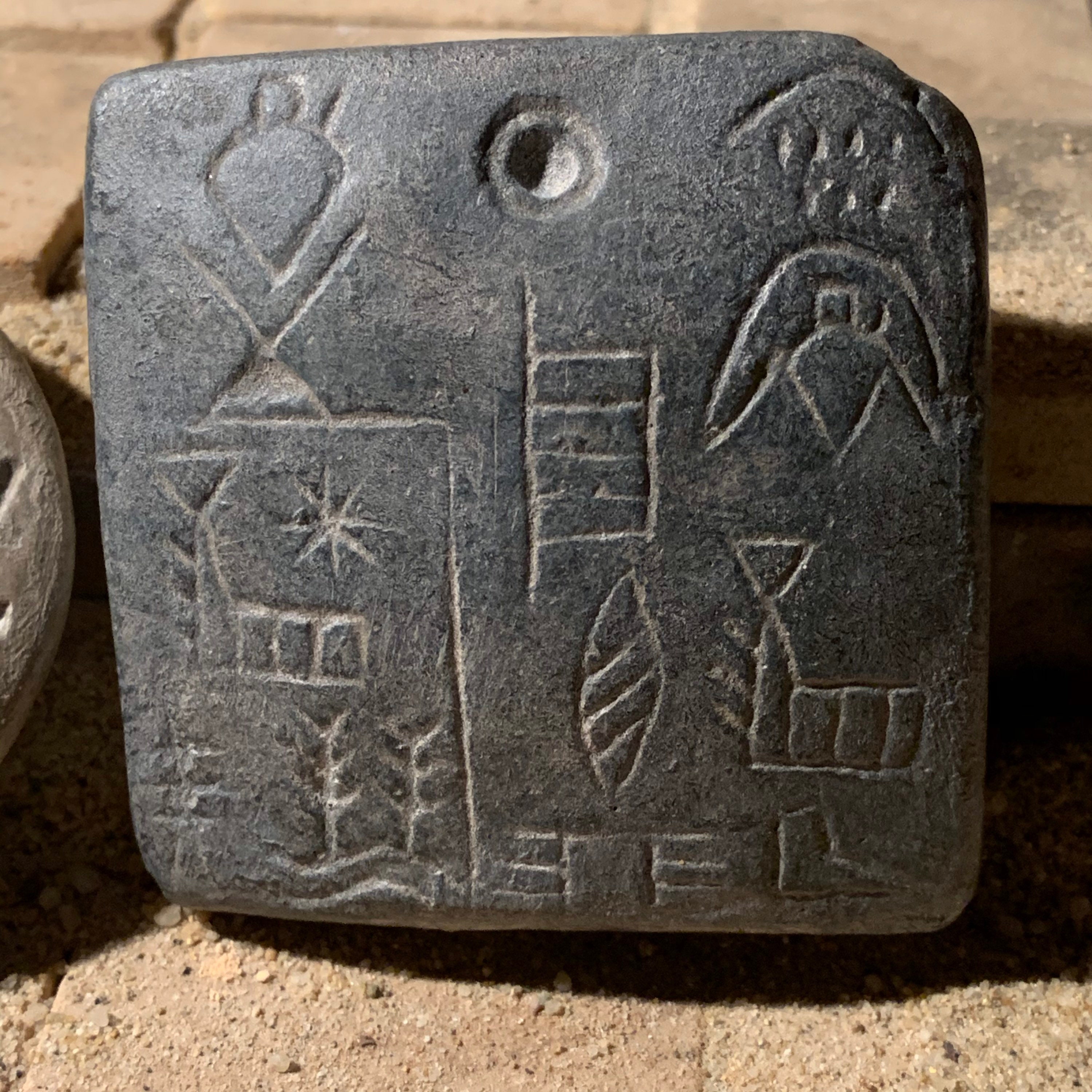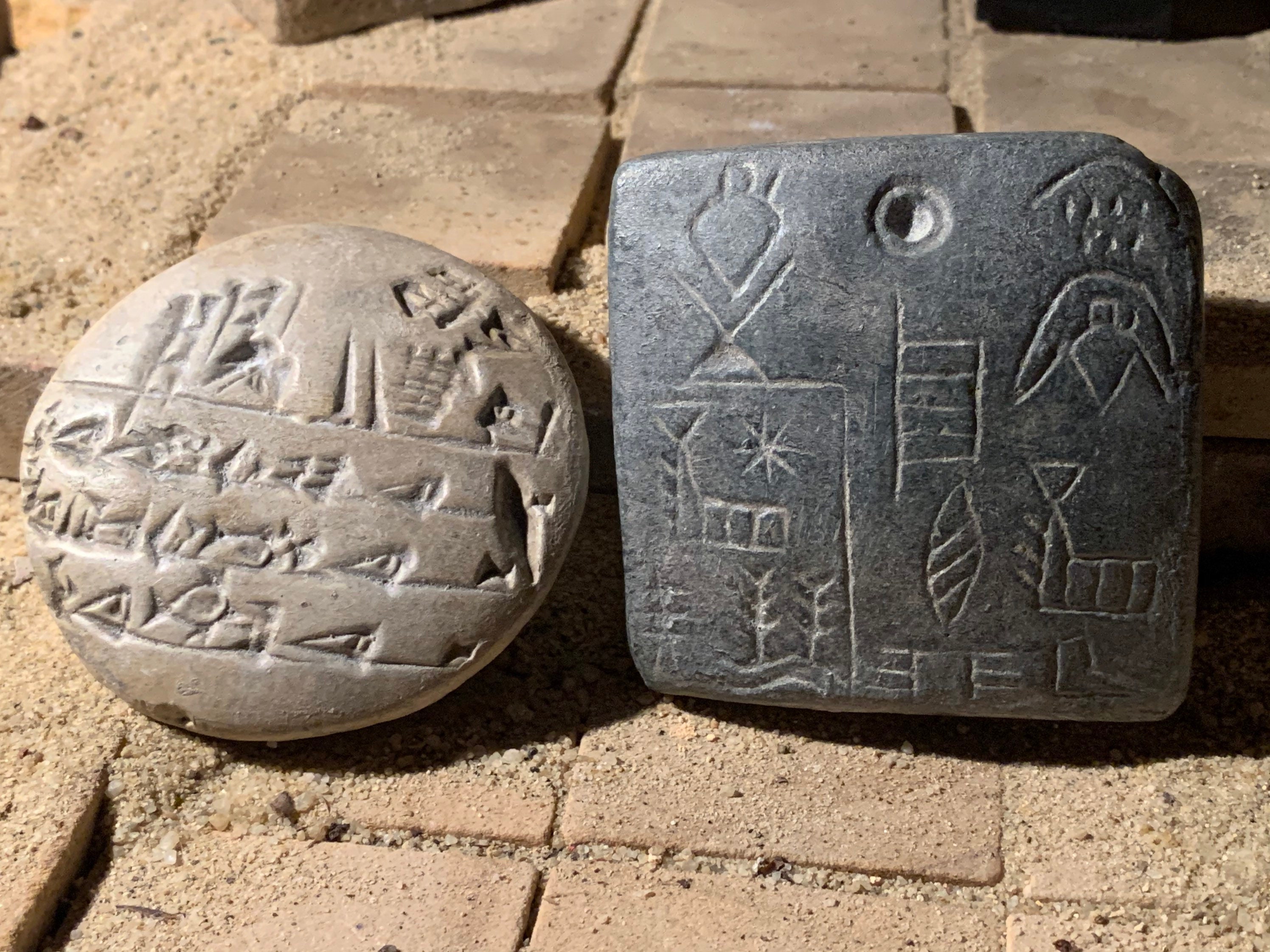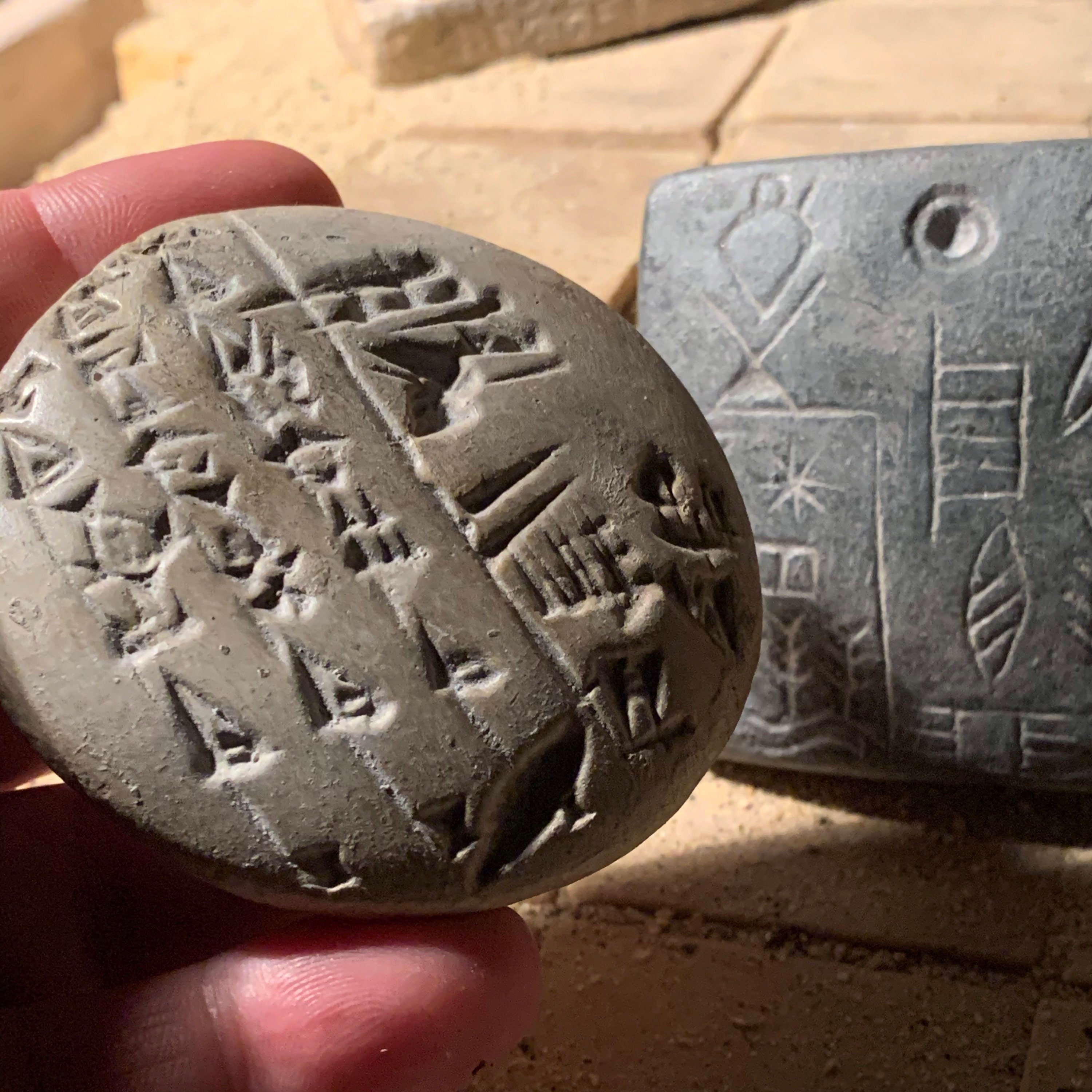 The writing that appears on the square tablet is one of the very earliest cuneiform incriptions. This is an exact replica of an early Sumerian pictogram text associated with land ownerhip. This was the type of writing used in the proto-urban period of Mesopotamia - near the end of the 4th millenium B.C.E.