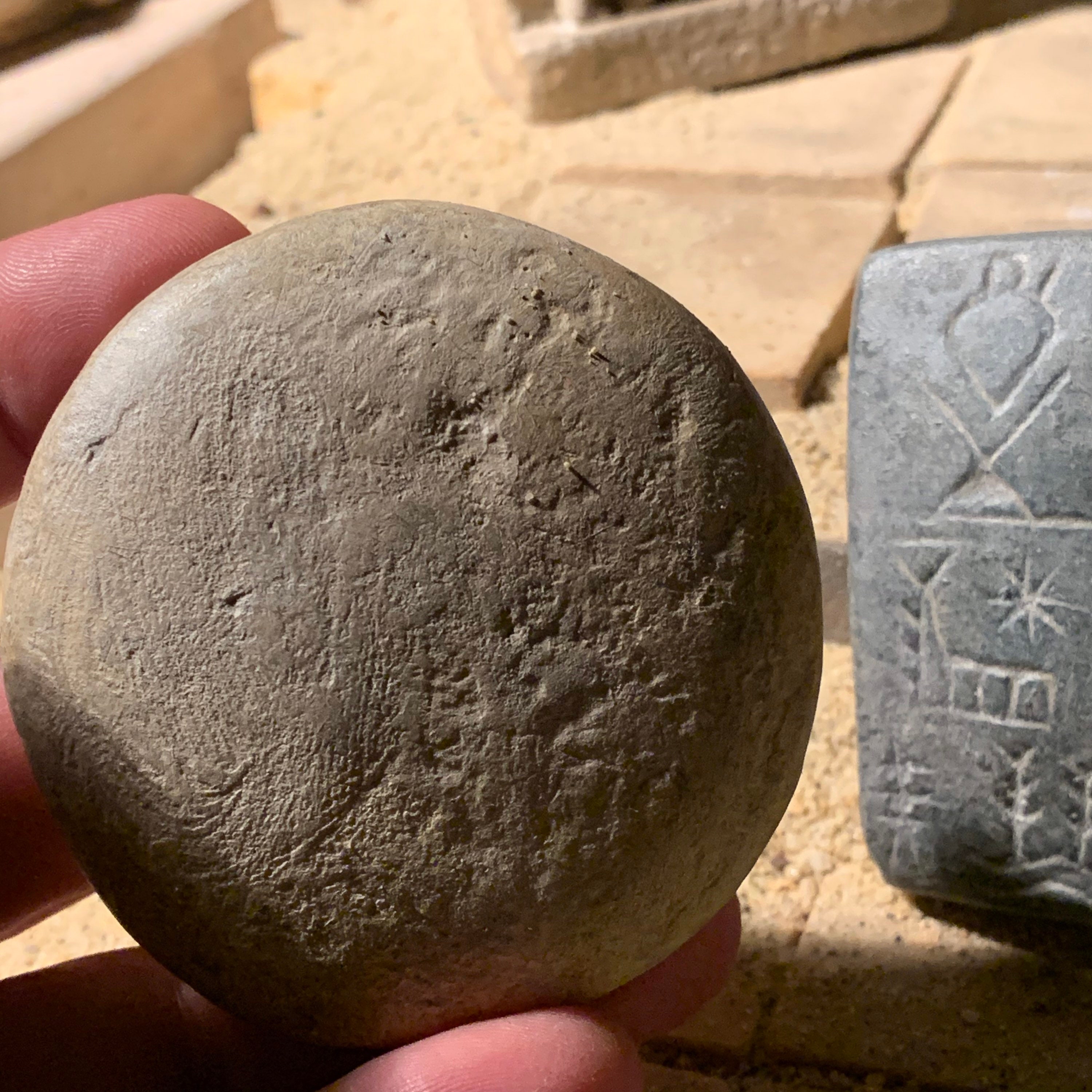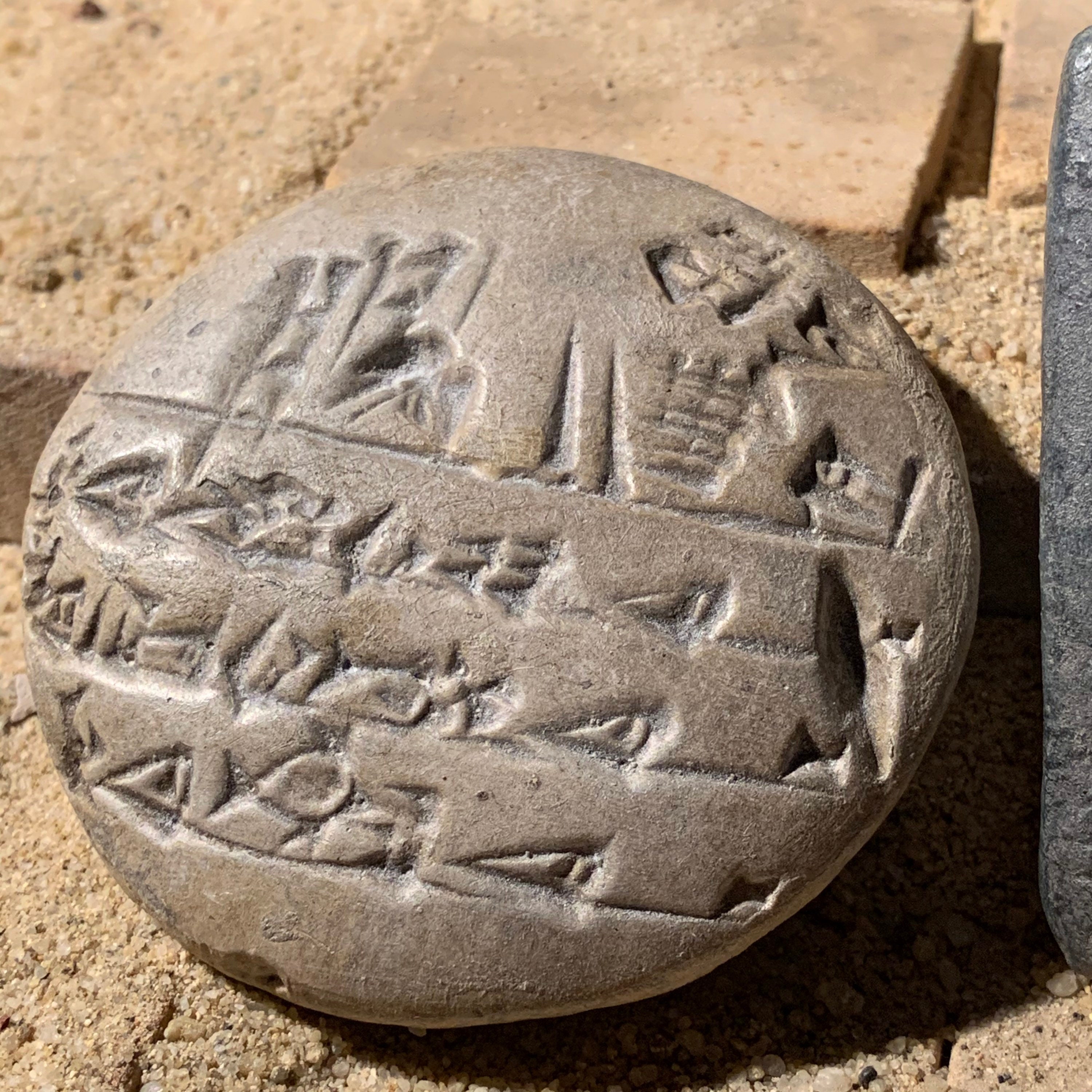 The circular disc has very precise characters of text which suggests it was made in a royal workshop. This is a much more complex and ordered use of ancient writing of a type used in later Sumerian culture as well as Babylonian and Assyrian. A likely translation for this rare object would be a temple foundation prayer or a document of it's dedication ritual.
