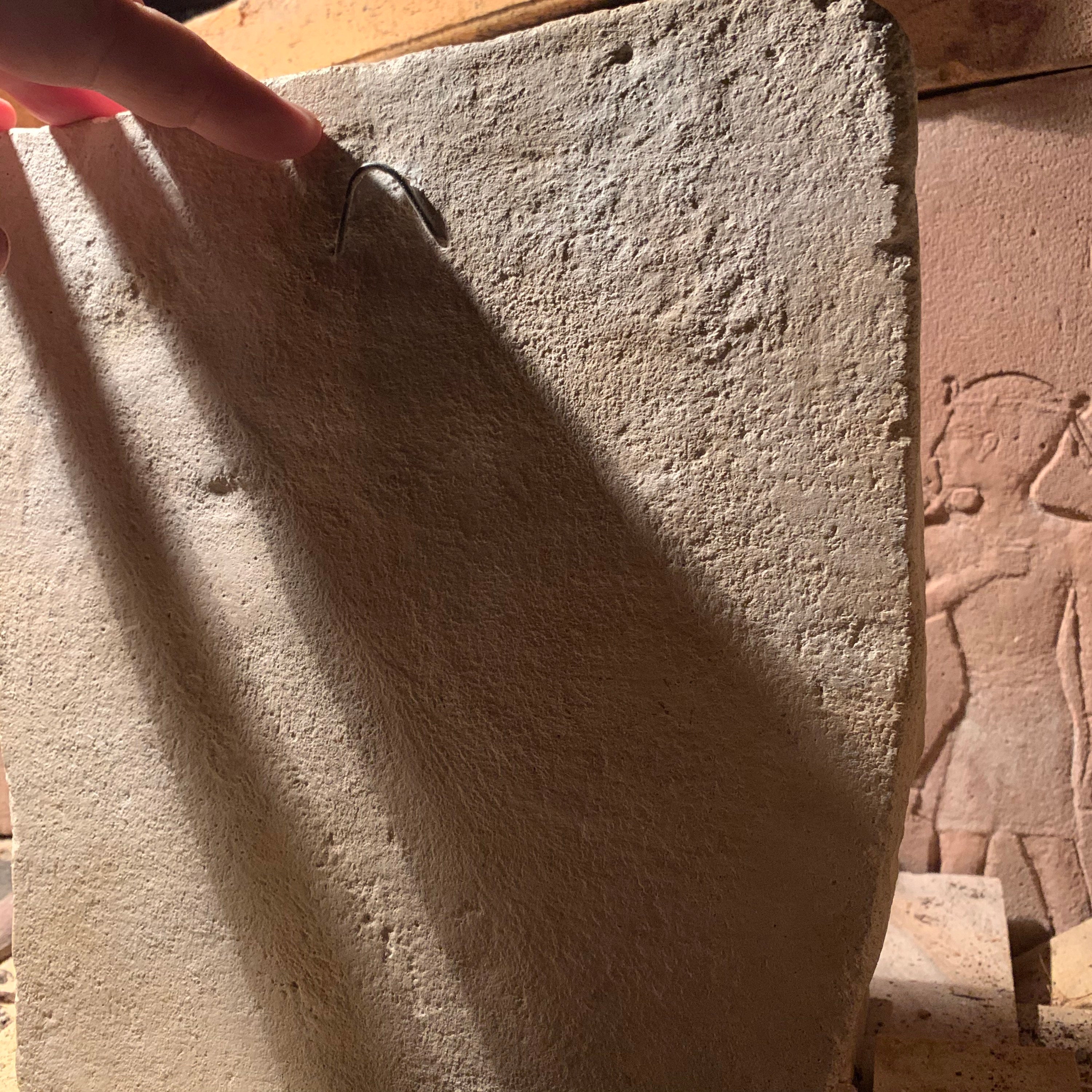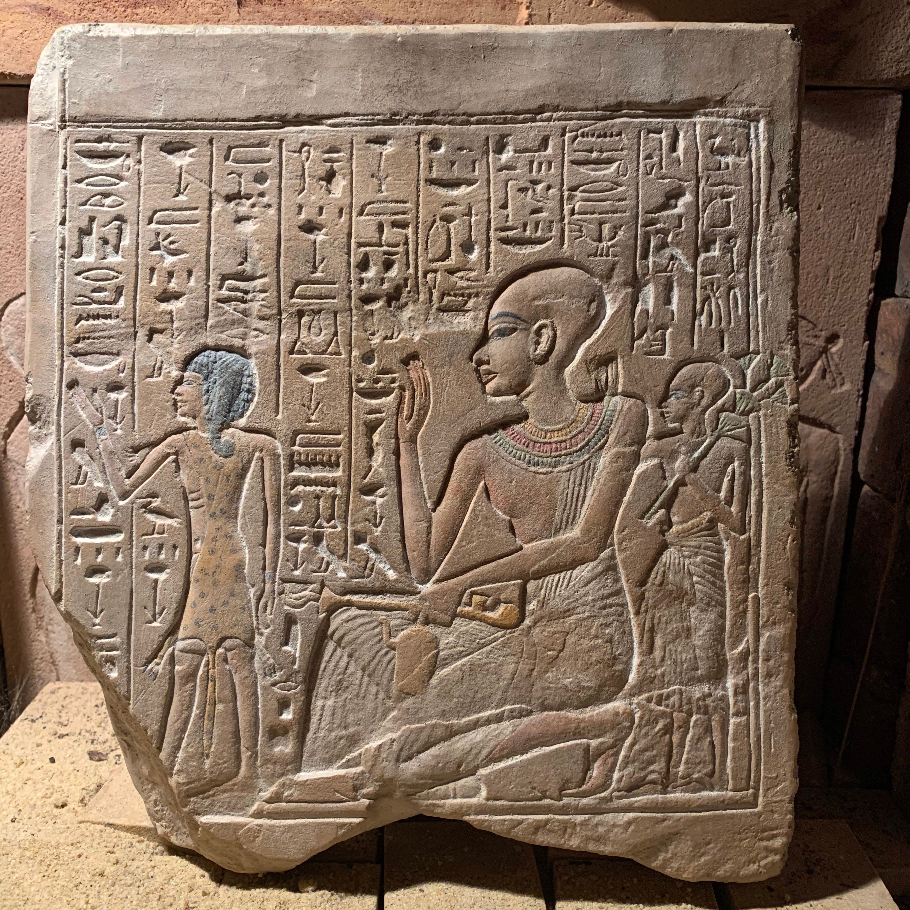 The original piece was part of a larger scene from the owner’s mortuary chapel and was carved out of limestone in ancient Saqqara just south of modern day Cairo. It was made for an interesting official named Hatiay who is depicted as the large central figure with his son Ptah-mes behind him.