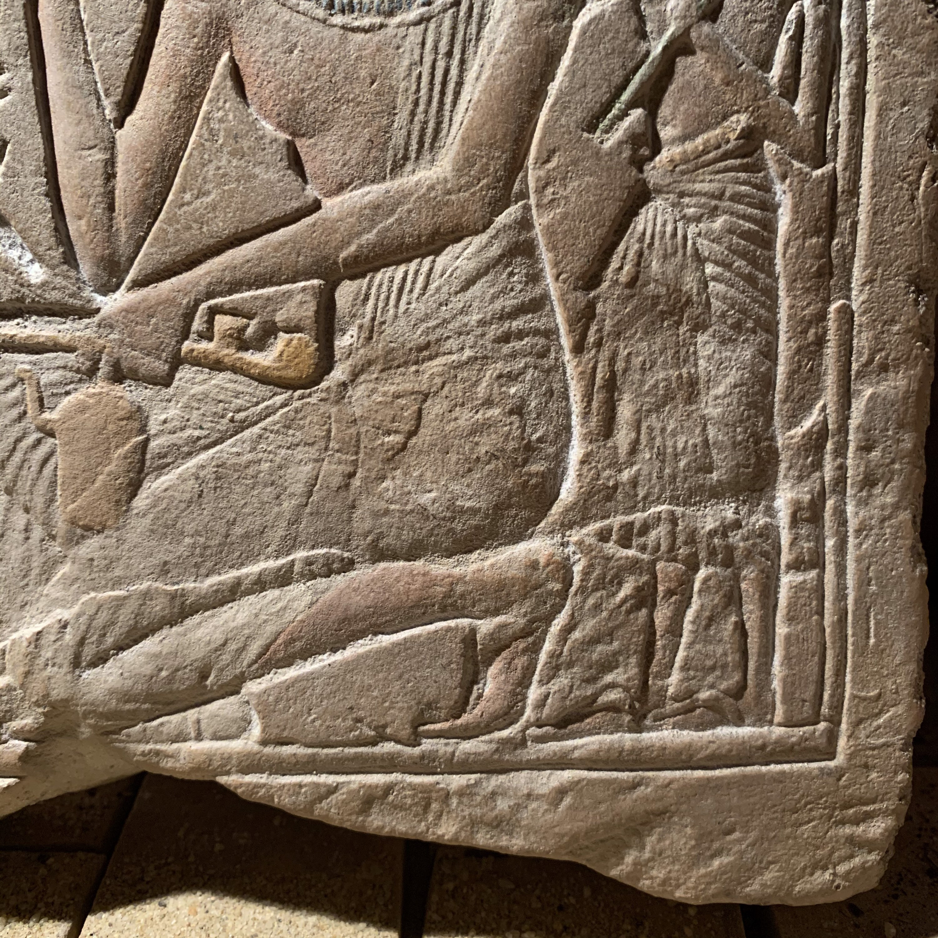 The shape of the heads are the most revealing aspect of this fragment for those who love the Amarna period.The fine hands and the pleated costume show how the artistry of Akhenaton’s revolution had infiltrated deeply into the sculptors hand.