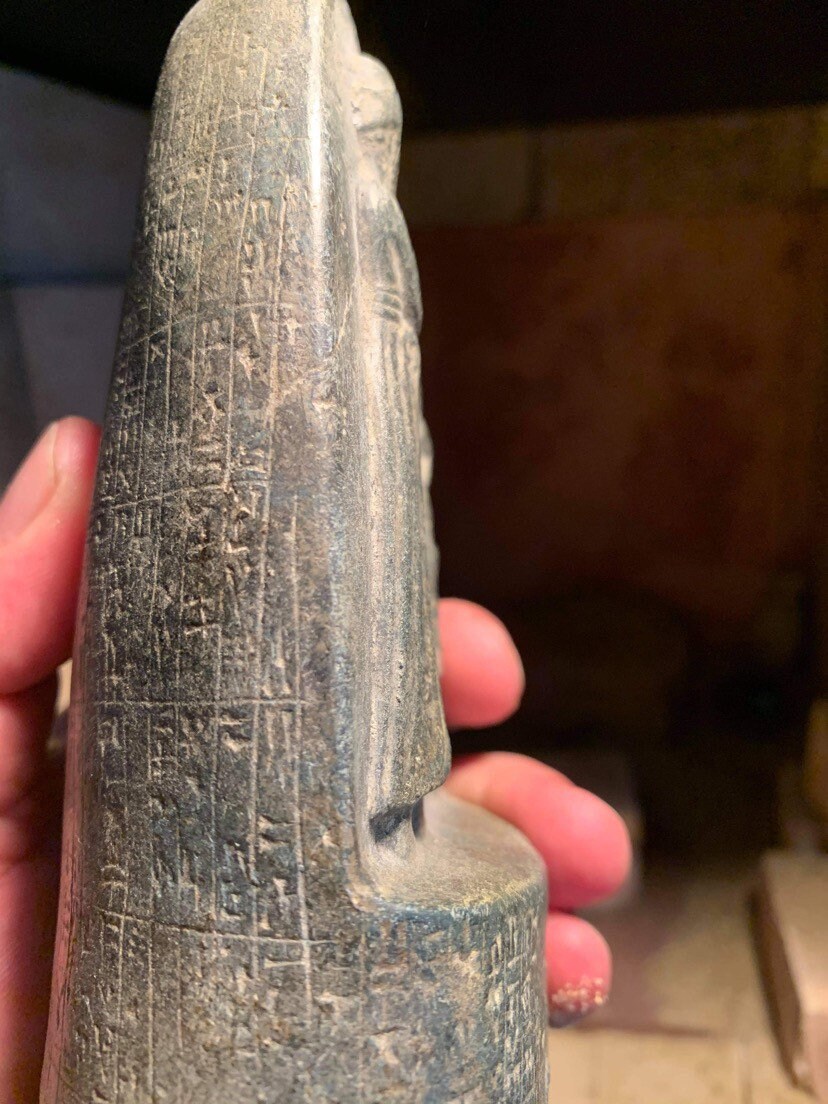 This small version of the large monument shows the upper part of the finger and it is covered with fine Akkadian cuneiform text documenting the first laws.
