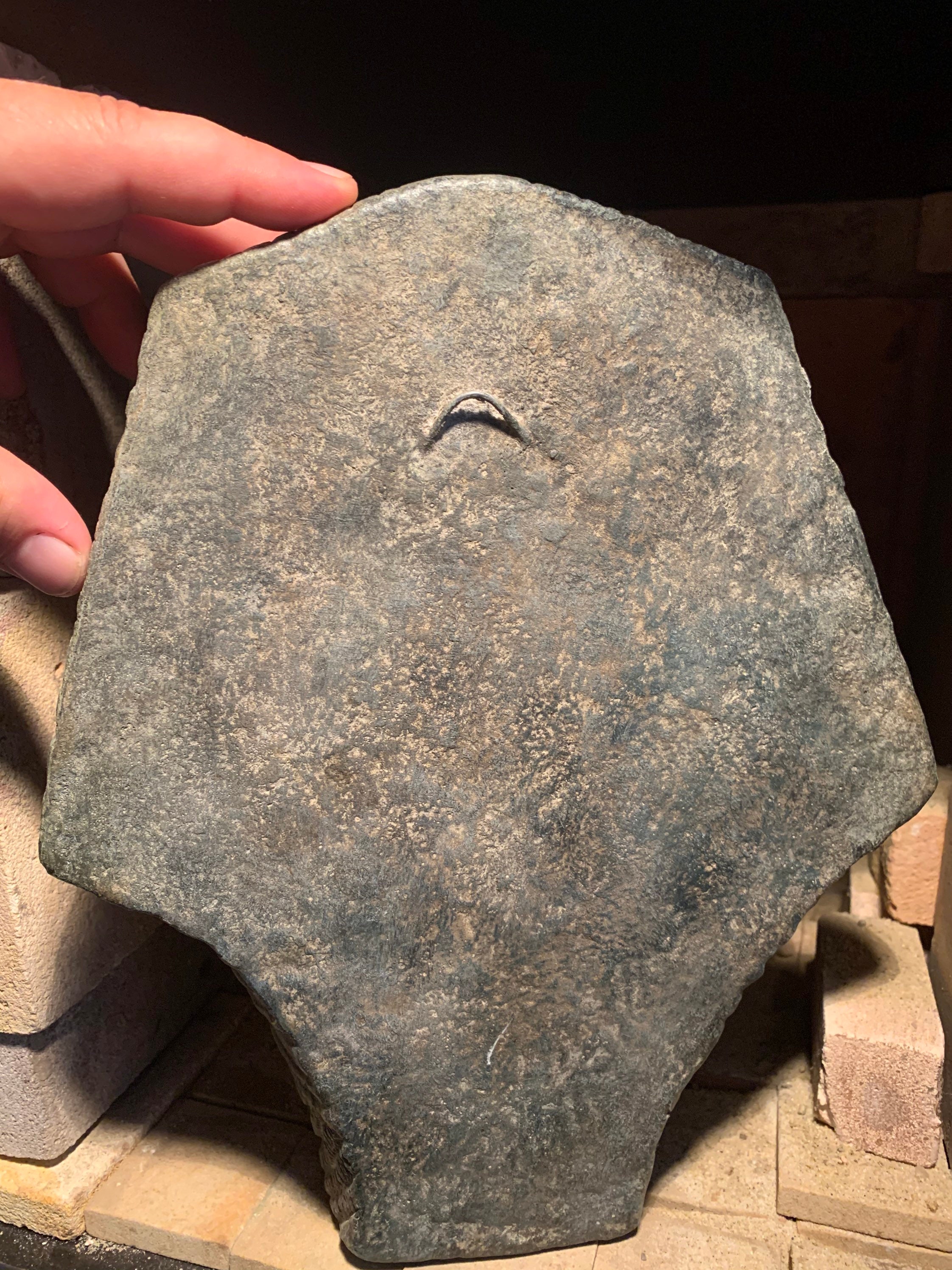 Made of a limestone and quartzite composition used for museum quality replicas It has an aged slate black patina. The wall feature mask has a carefully drilled hole in the back to receive a nail or hook for the wall display option.