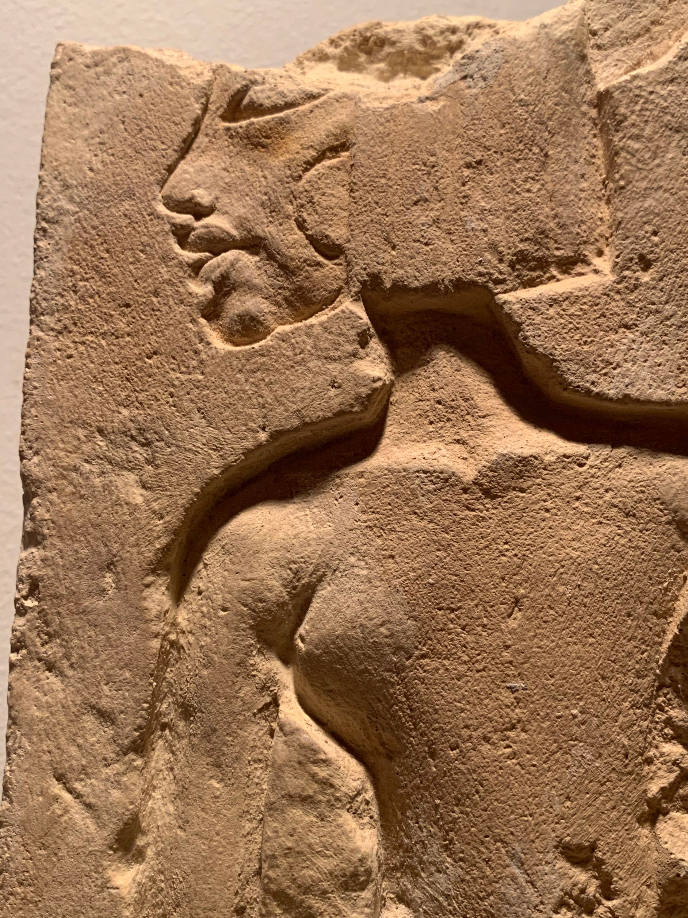 Only a trace of reddish flesh colour has been given to the face and limbs which gives this light ochre coloured fragment a hint of contrast and yet more interest.