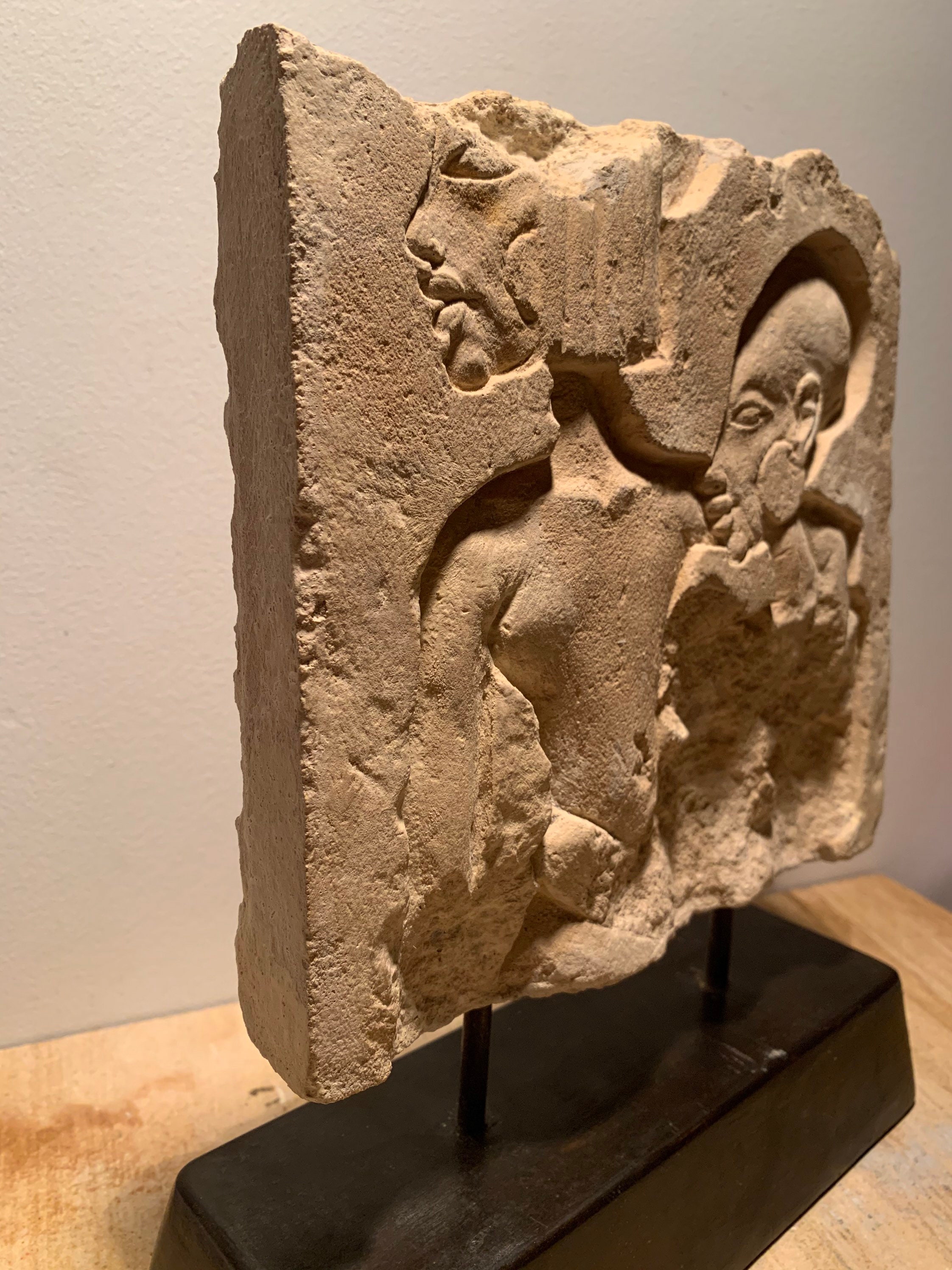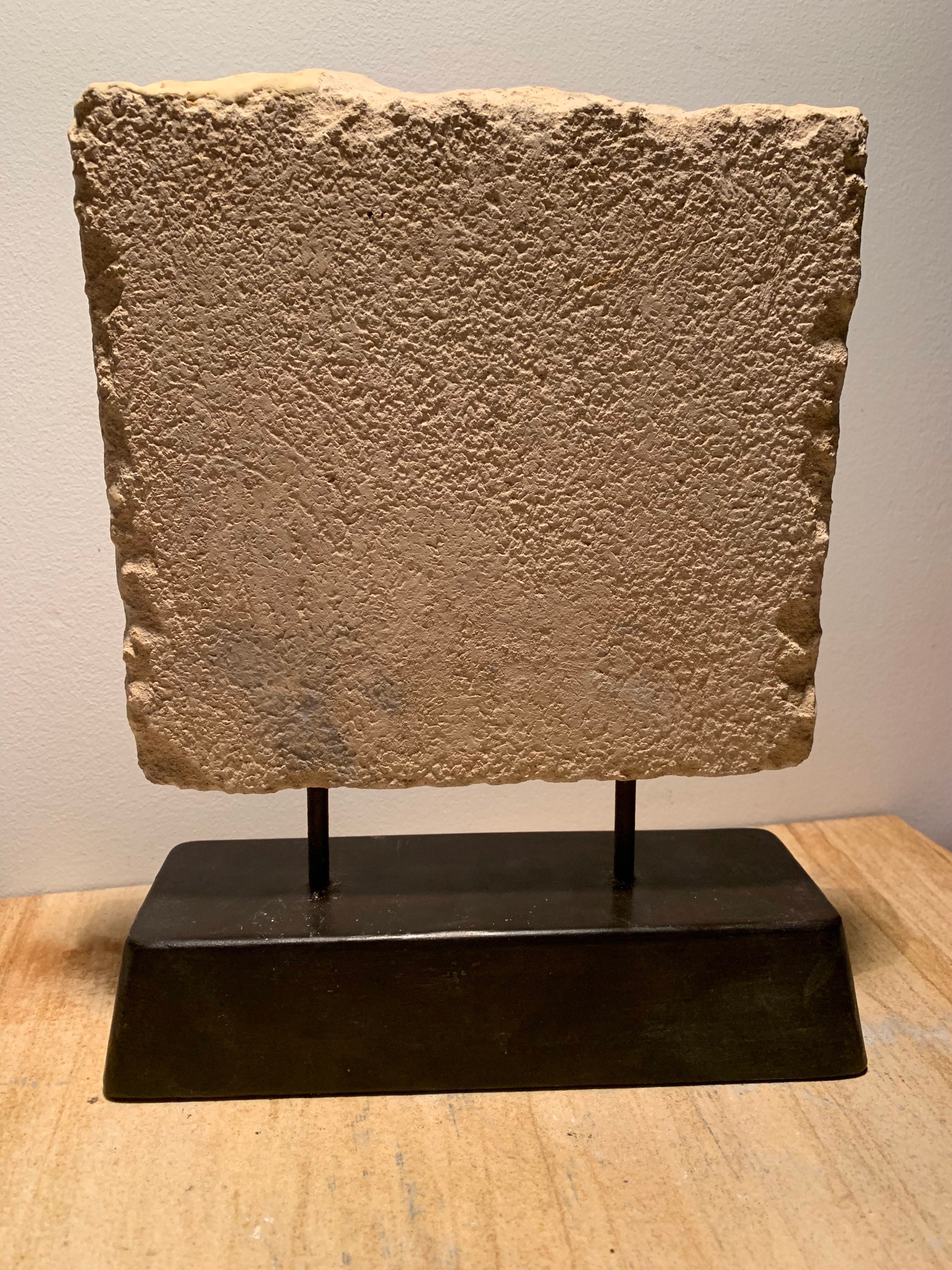 Made of a limestone and quartzite composition stone this artwork is a replica of an actual fragment. It preserves all of the details of the original and I have made it look as close as possible to it. It is mounted on a removable, felt based stand.