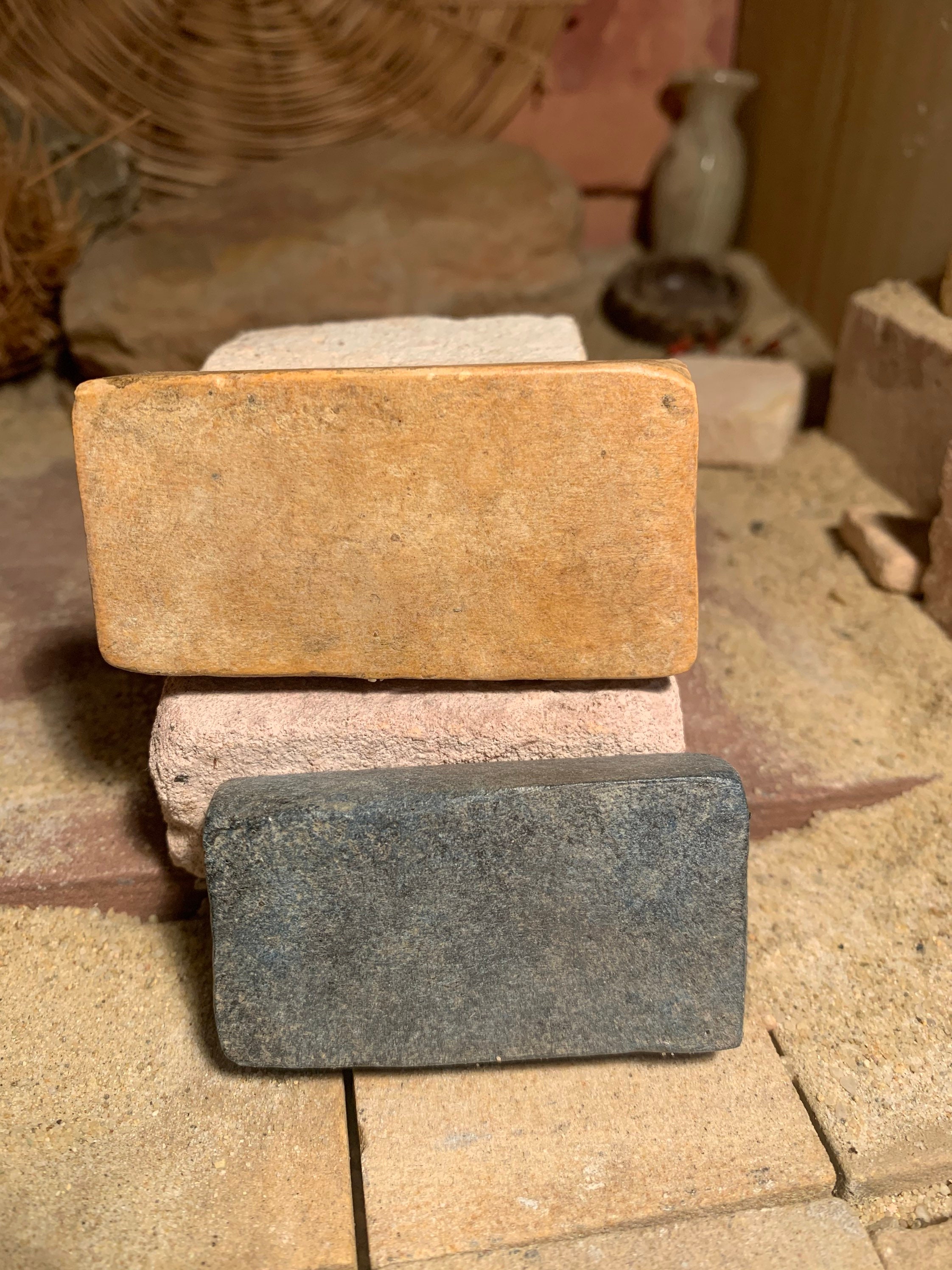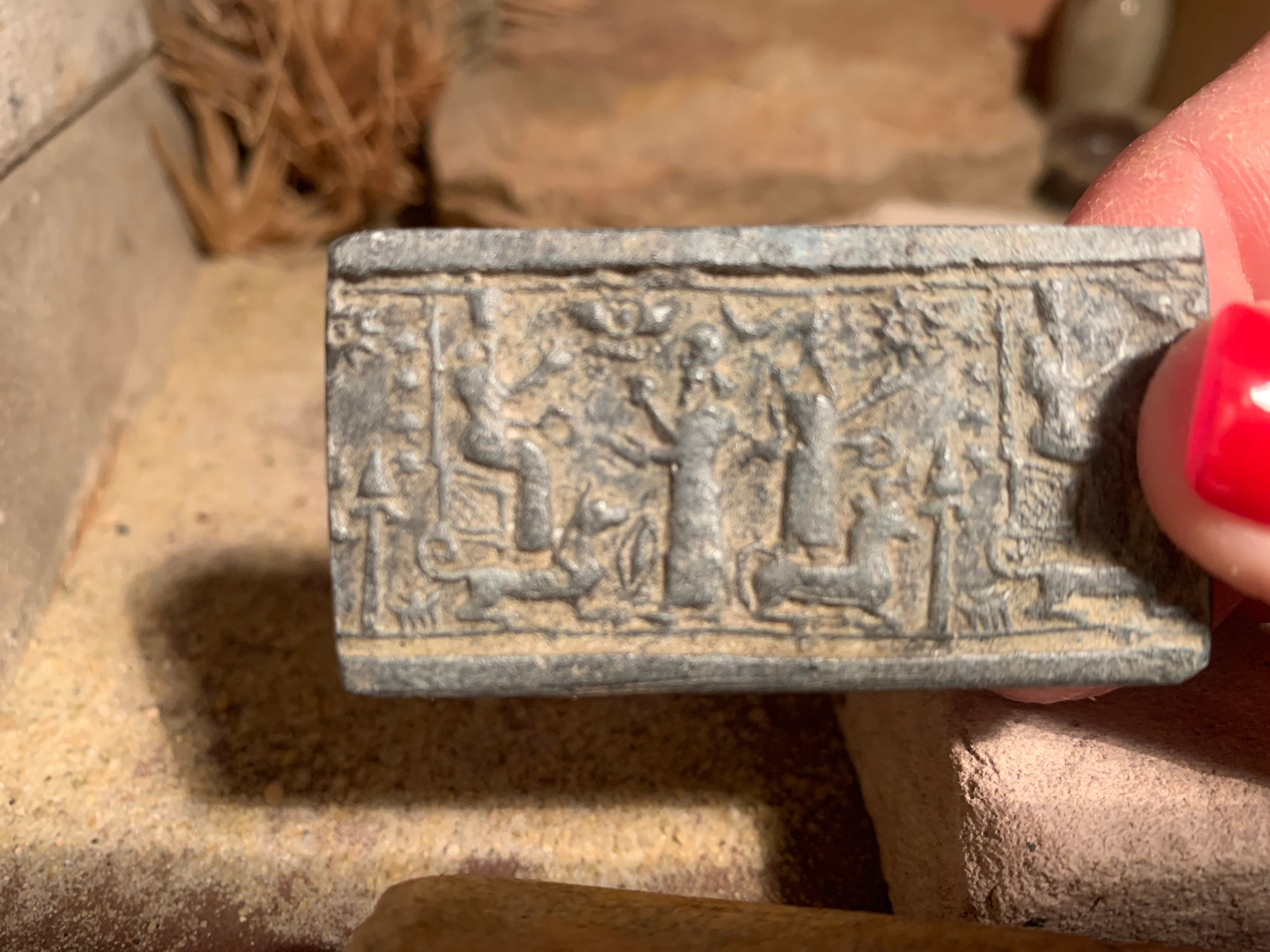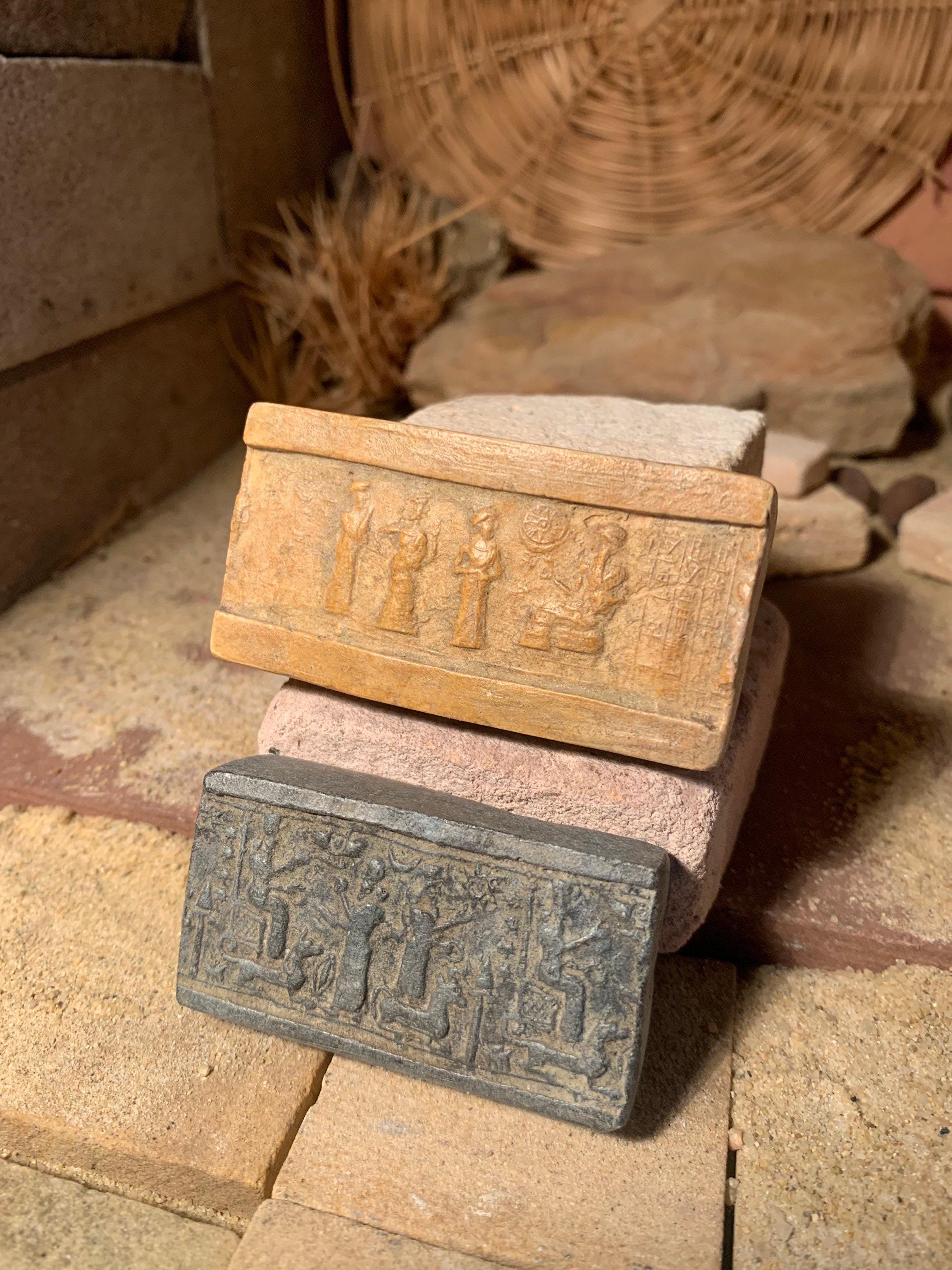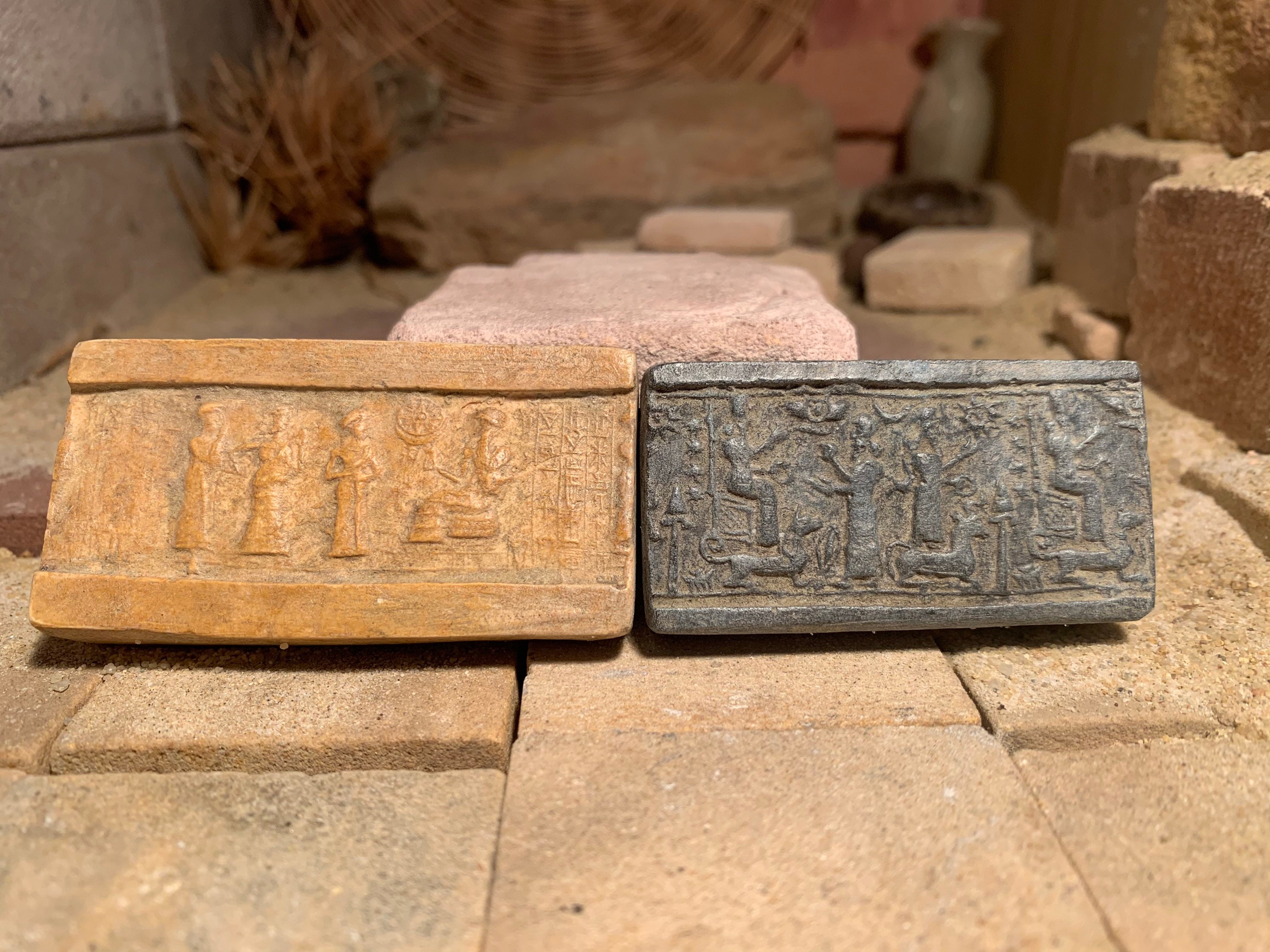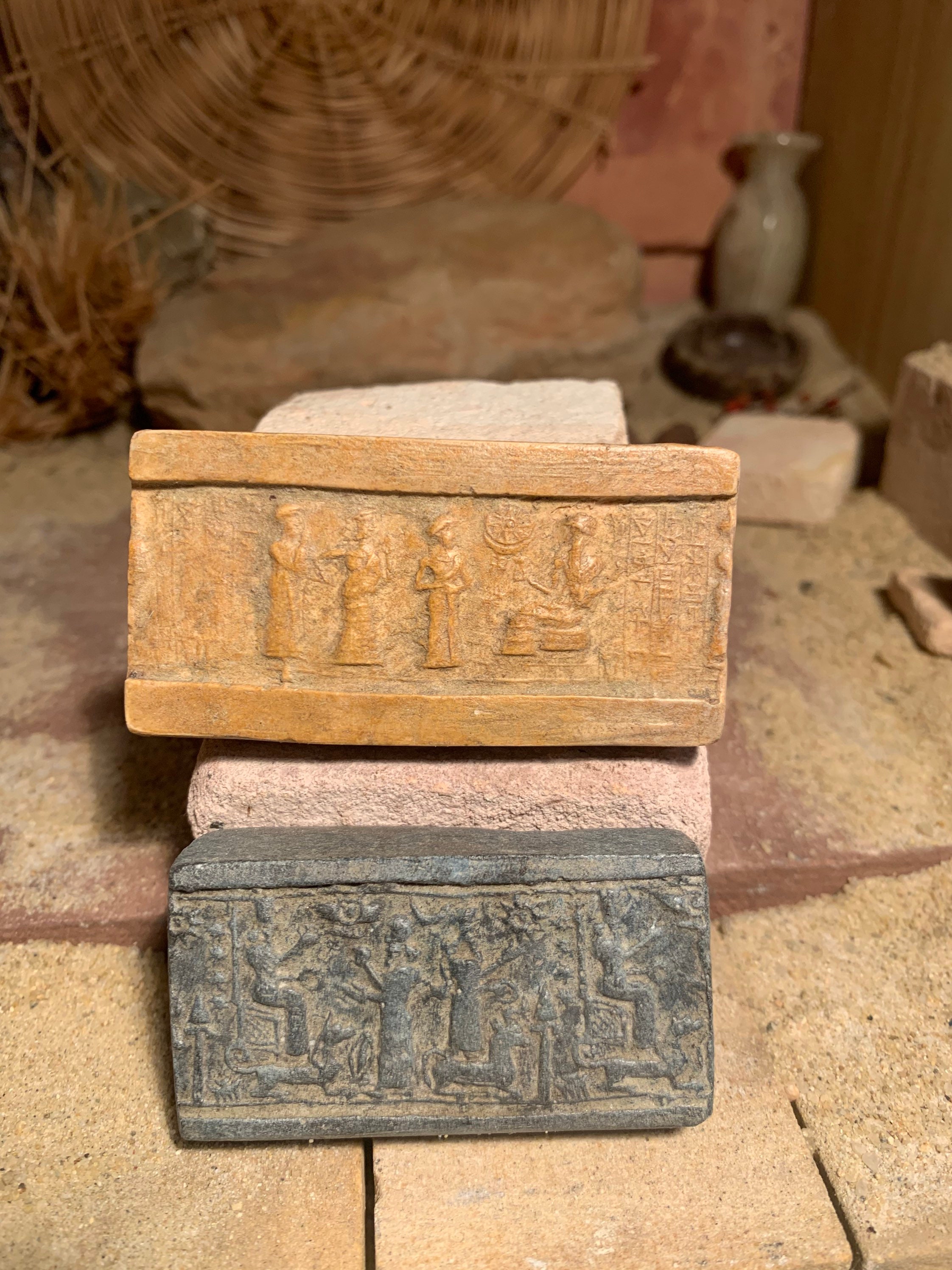 On offer here are a pair of rare seal impression replicas of Assyrian and Sumerian design. Made of limestone and quartzite composition stone, they have aged patinas.