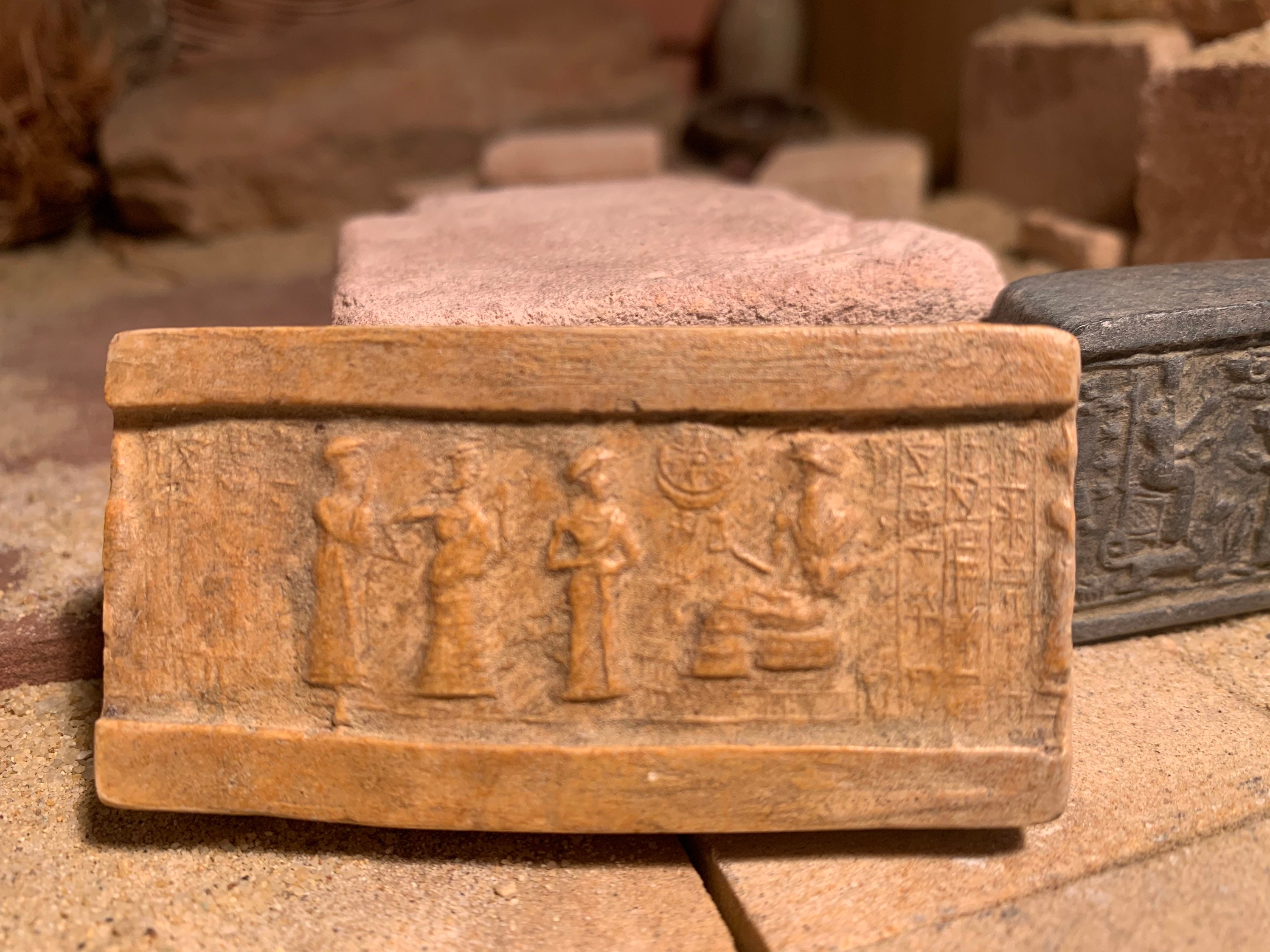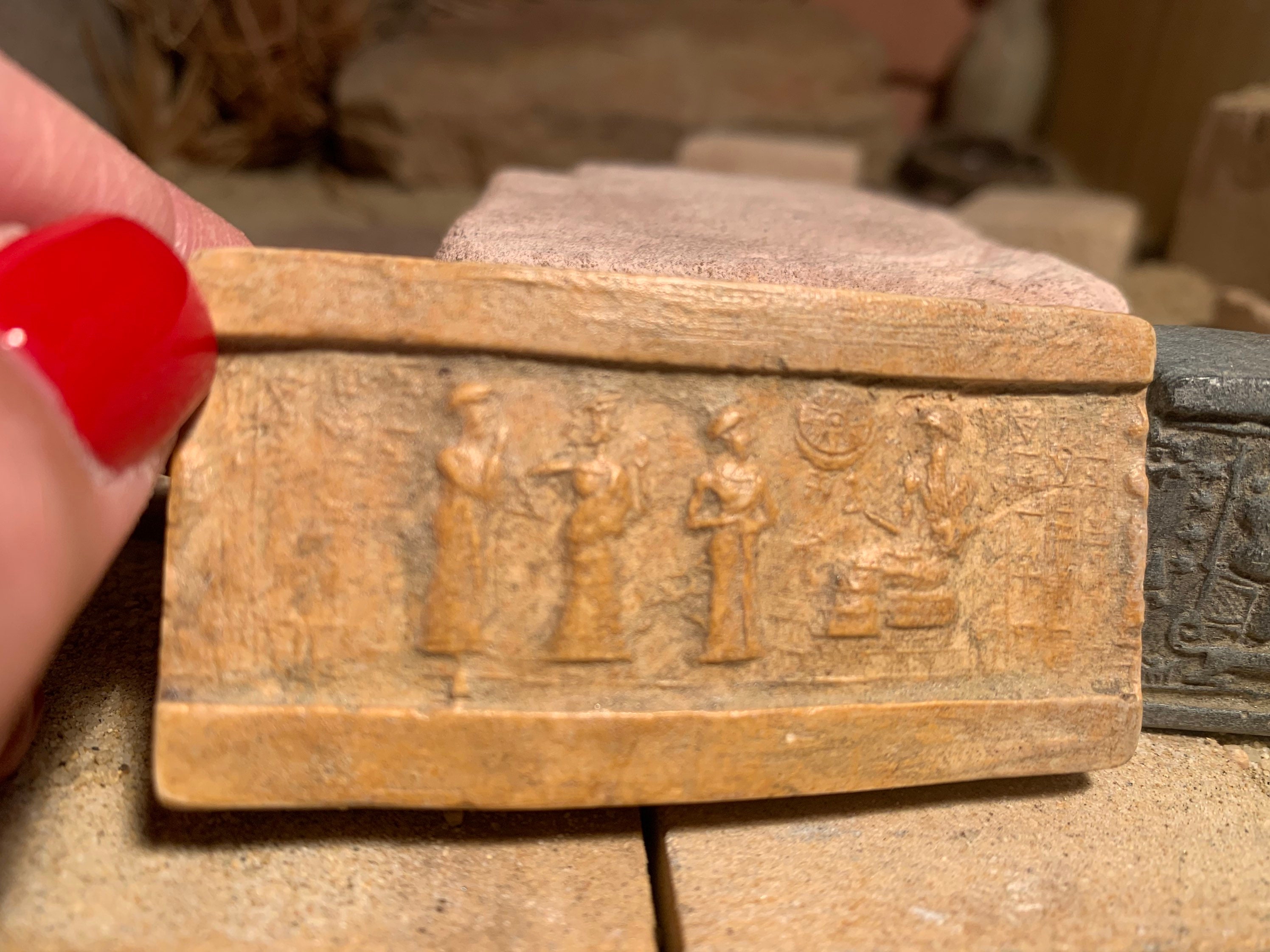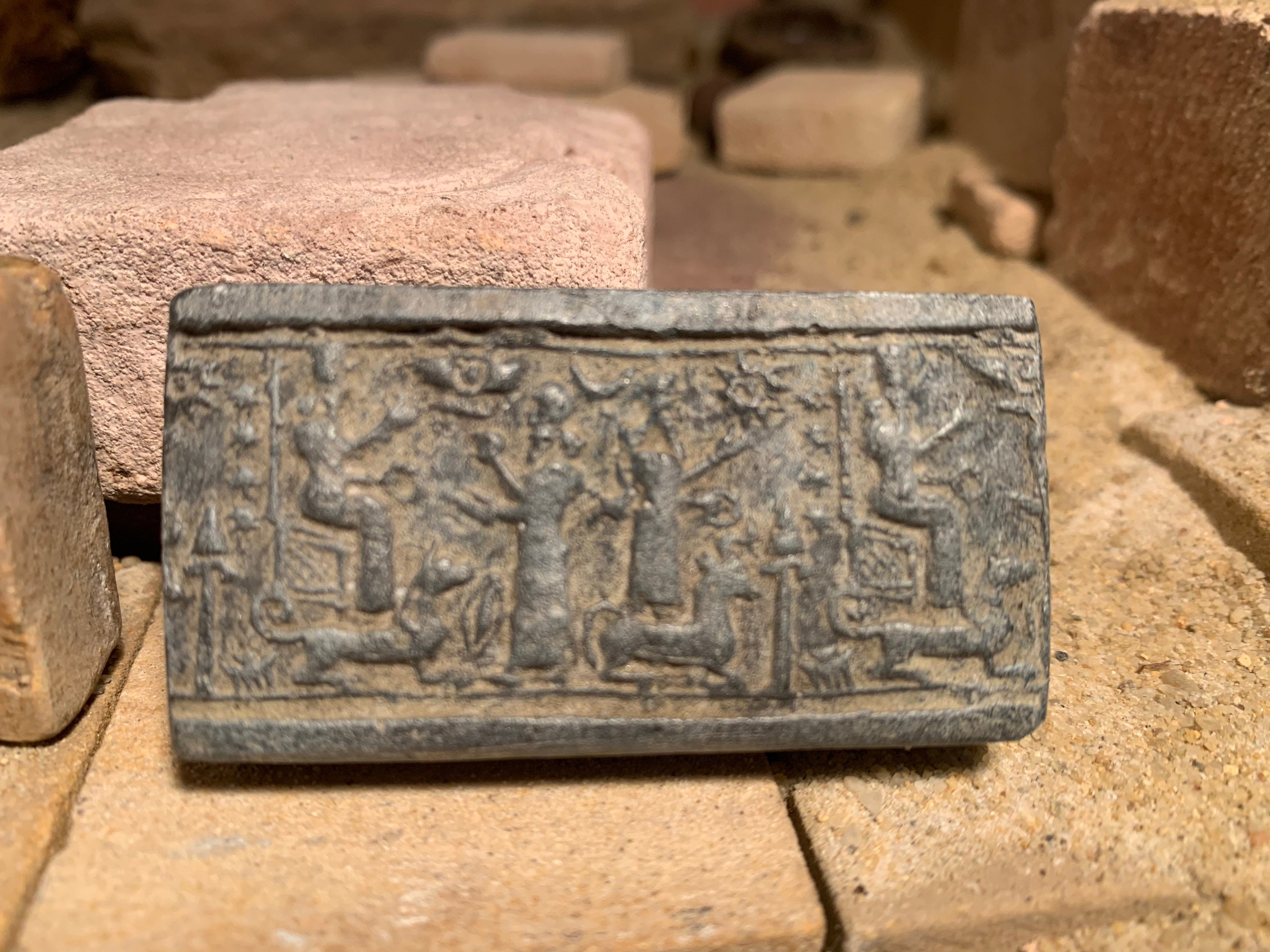 This seal is a typical example of the type created in the third dynasty of Ur. A worshipper is lead by an interceding goddess to an enthroned Ur Nammu followed by a cuneiform inspcription that denotes the owner of the seal as a trader.