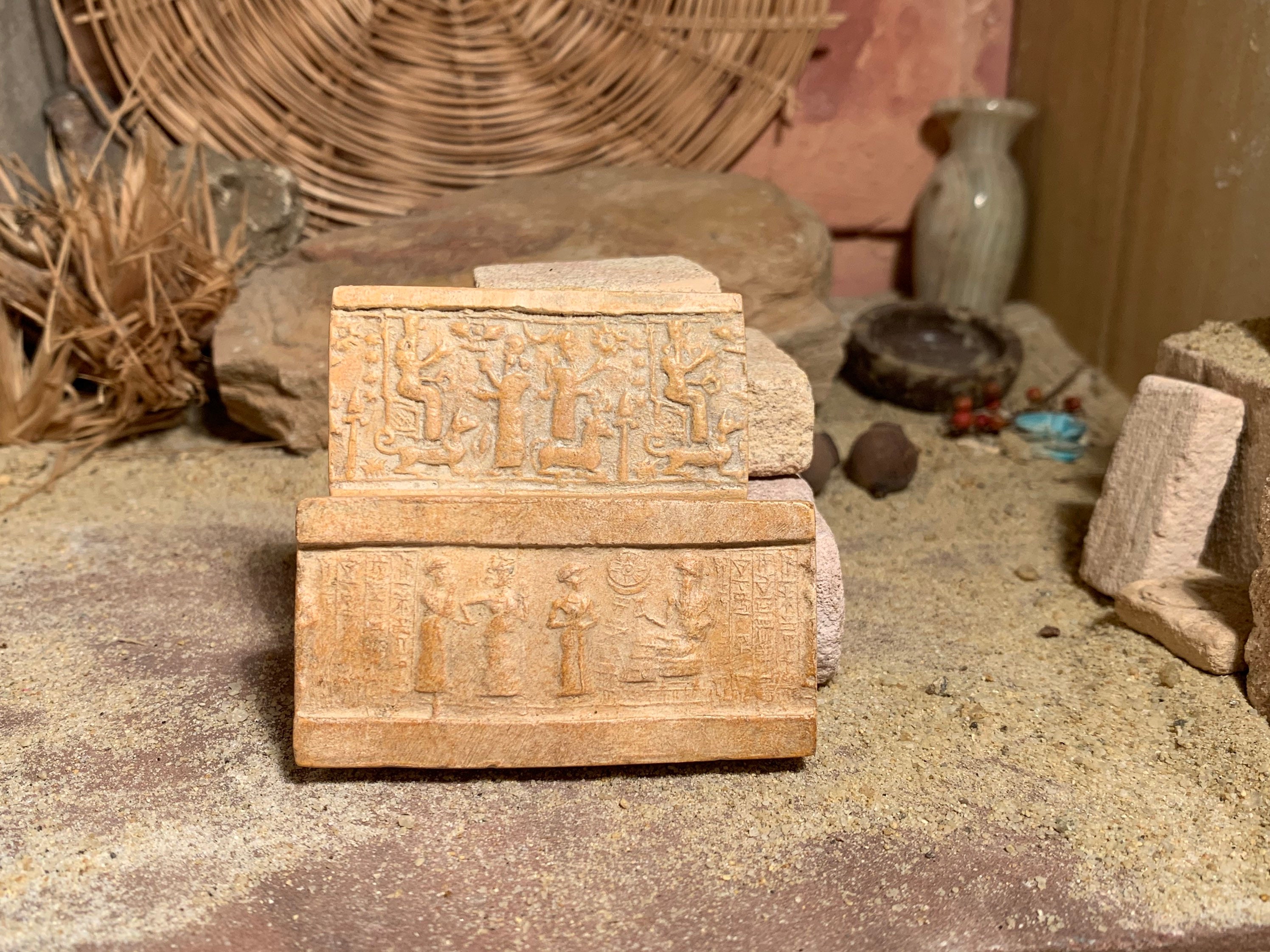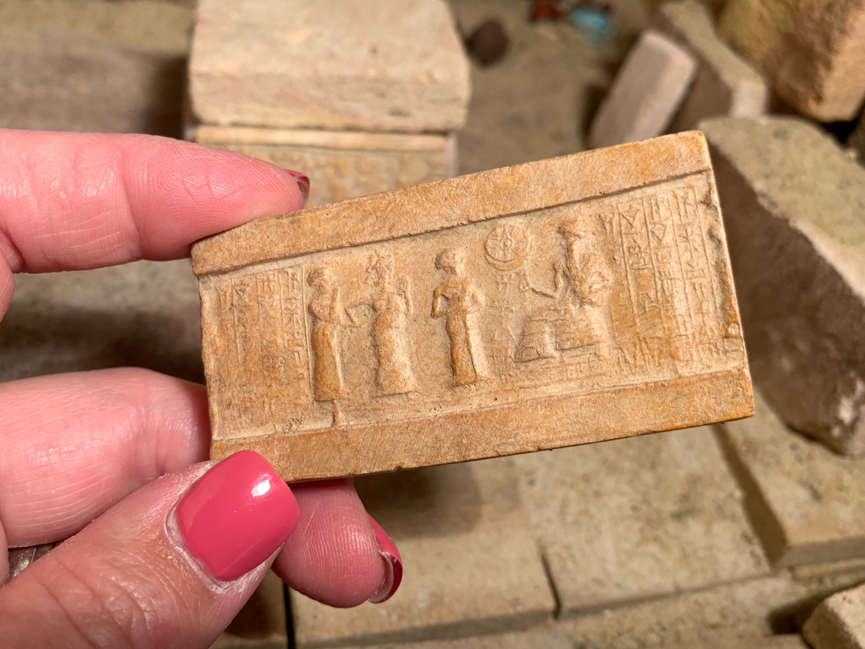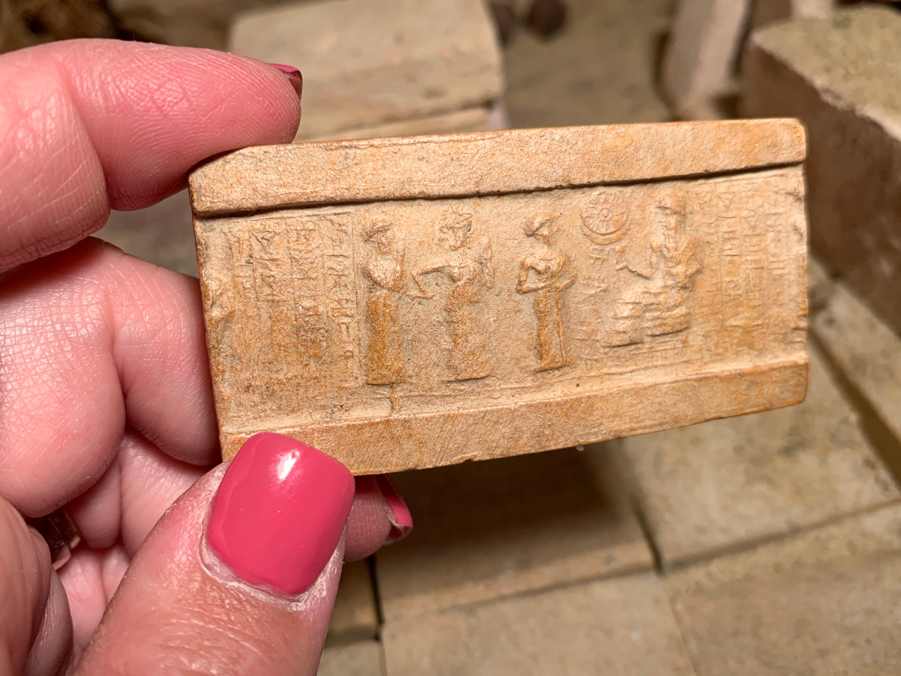 This seal is a typical example of the type created in the third dynasty of Ur. A worshipper is lead by an interceding goddess to an enthroned Ur Nammu followed by a cuneiform inspcription that denotes the owner of the seal as a trader.