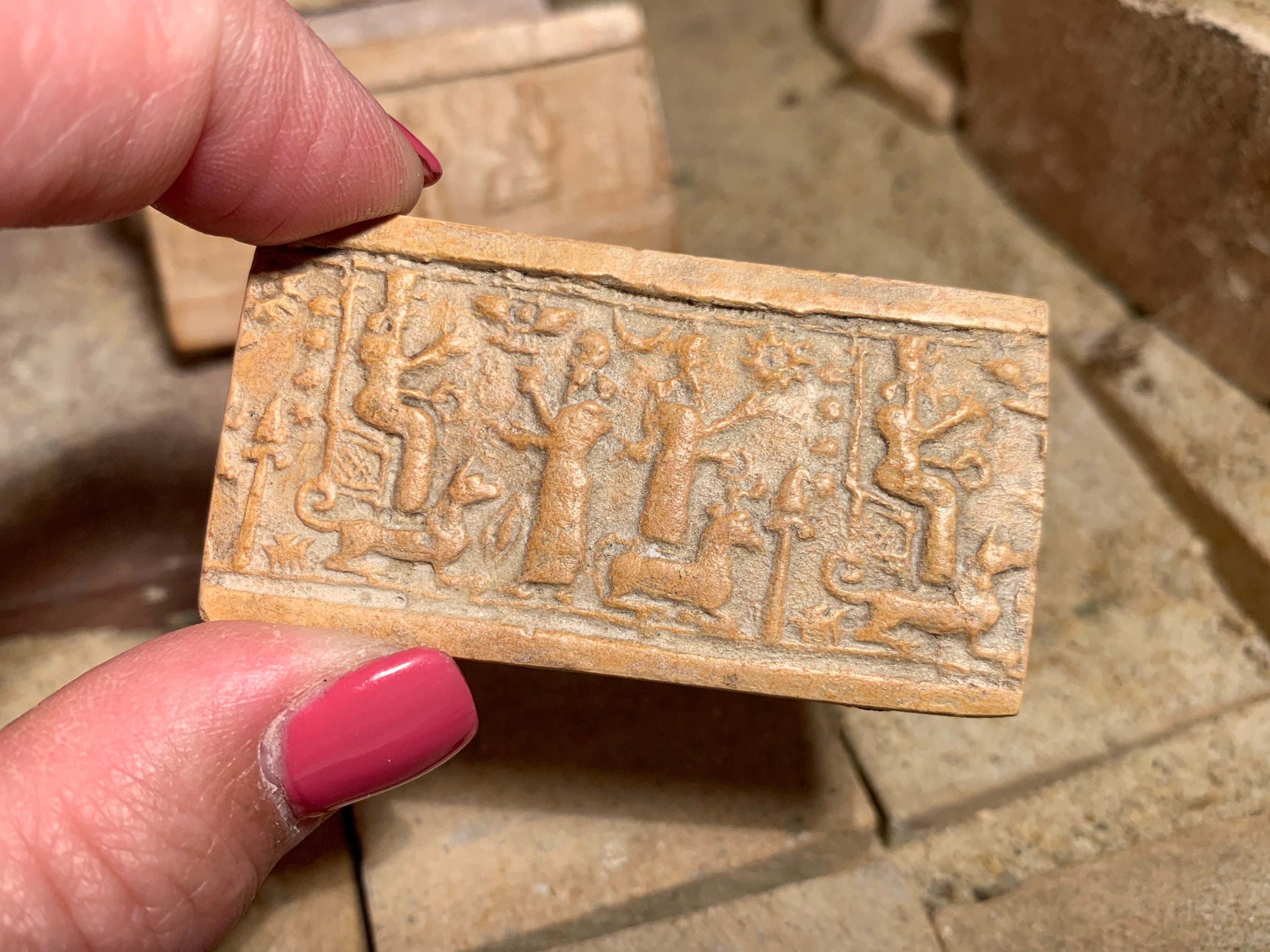 On offer here are a pair of rare seal impression replicas of Assyrian and Sumerian design. Made of limestone and quartzite composition stone, they have aged patinas.