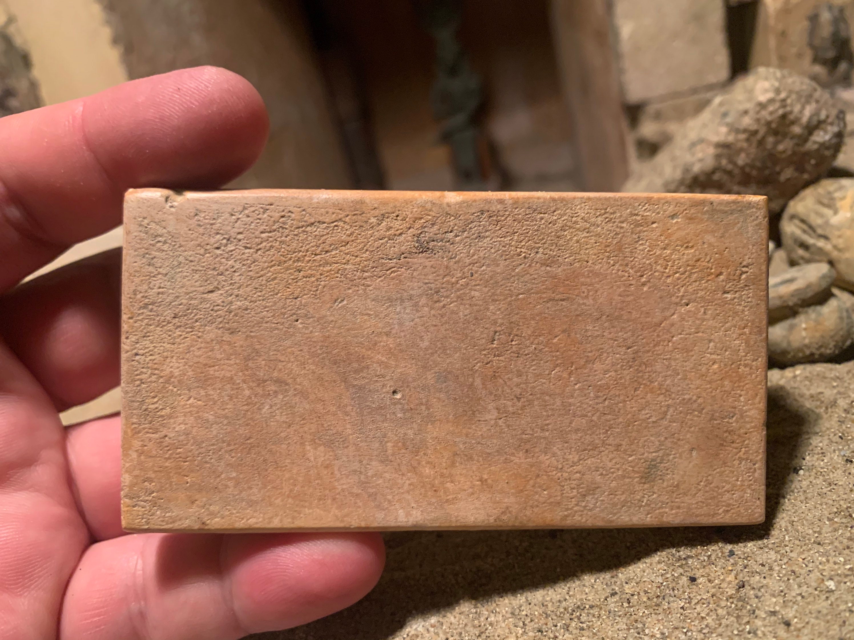 Made of a limestone and quartzite composition stone this piece has an aged patina with a light polish.
